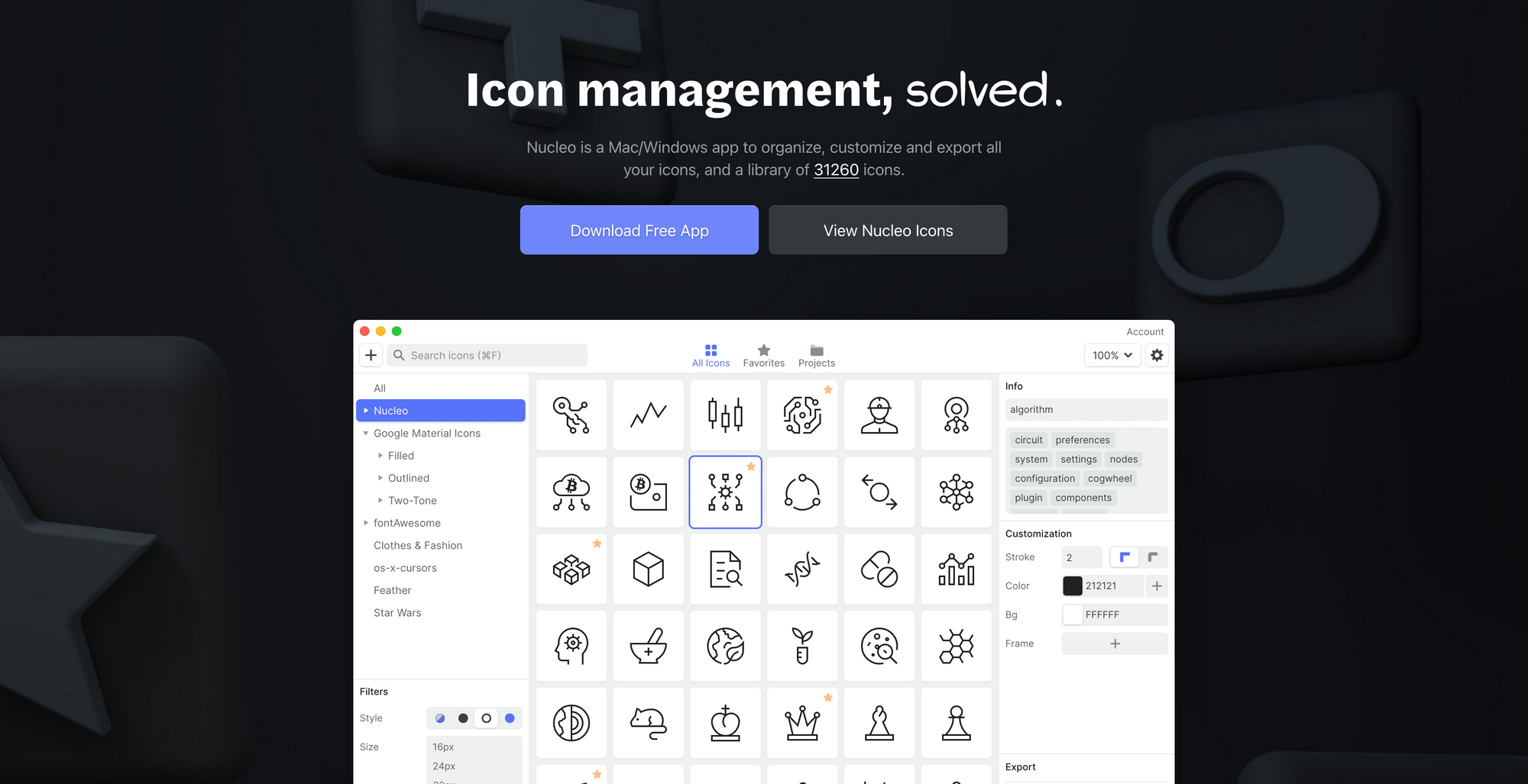 Nucleo also features in-app customization tools, so you can quickly change and edit colors, stroke, background, or the frame of your icons. If you are working across a team with developers, Nucleo gives you advanced export features, so you can export multiple icons, set custom resolutions, create icon fonts and SVG symbols, and copy inline SVG code, grab CSS class names and manage SVG symbols with no need for demo files. If you want to collaborate on your projects you can do so too by simply creating a team and add members to your collections and projects. Nucleo is the ultimate icon management tool.