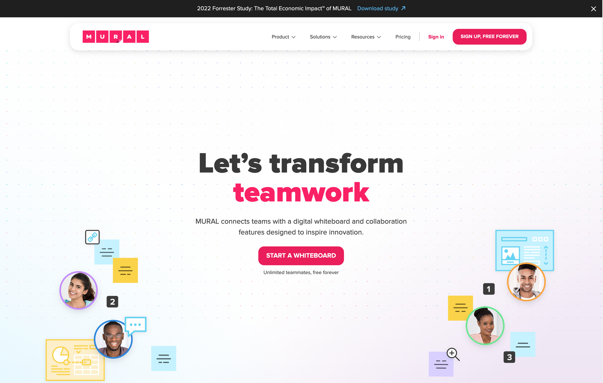 Mural is centered around a digital whiteboard collaboration space, where teams can work together in real-time or asynchronously. No matter if you want to brainstorm ideas, work on strategy and planning, doing research or analysis, Mural is a powerful tool offering guided methods, transformation expertise, and beautiful templates to kickstart innovation. Within Mural you will find a variety of flexible features to help your team work together and visualize ideas. You can effortlessly add thoughts, ideas, and feedback for further action to your whiteboards. To build diagrams to map out complex workflows, Mural has a set of shapes and connectors. Icons support you on your journey of building a visual story. Mural wouldnât be the powerful visual-first tool if it wouldnât allow you to drag and drop visuals onto the whiteboard or give you the opportunity to maximize creativity with freehand sketching and writing.