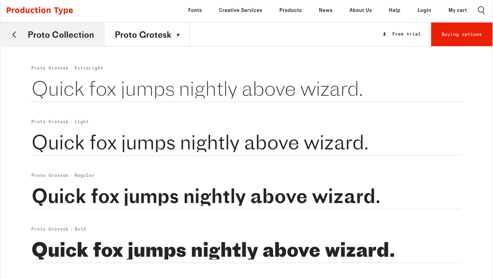 Proto Grotesk is a sans-serif typeface designed by Jean-Baptiste LevĂŠe with Sandrine Nugue and Yoann Minet. It was released through Paris-based foundry Production Type in 2014 and later expanded upon in 2015. The design was inspired by grotesques of the nineteenth century, described by Production Type as âan era when clunkiness was a virtue.â The family is available in four weights, as well as a slab serif version.