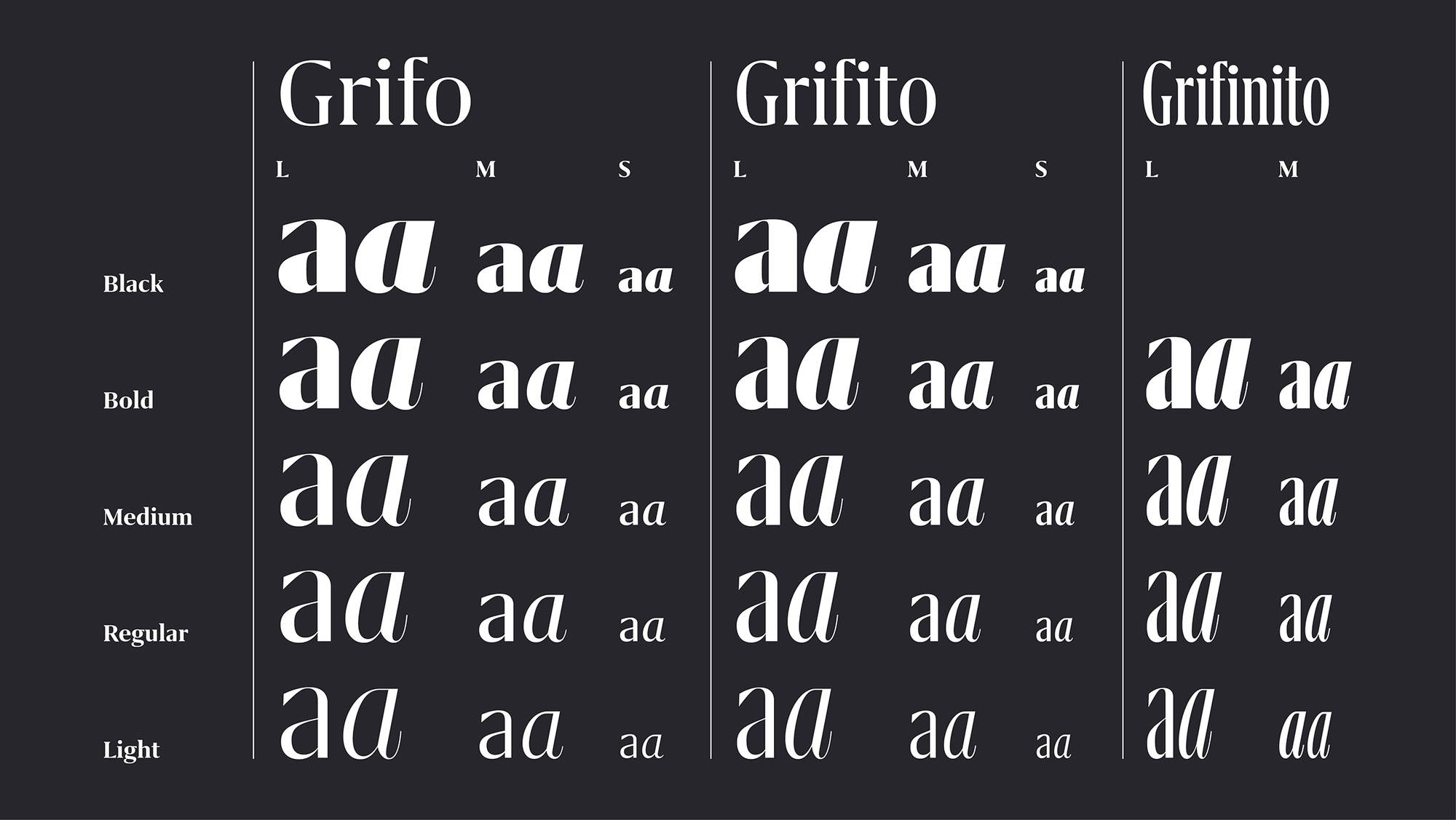 Grifinito is a serif typeface designed in 2017 by Portuguese type designer Rui Abreu. It was created as the compressed companion to Grifo and Grifito, for use in titles where space is a concern. Grifinito is available in two optical sizesâM for titles and L for big headlines, each with four weights and matching italics.