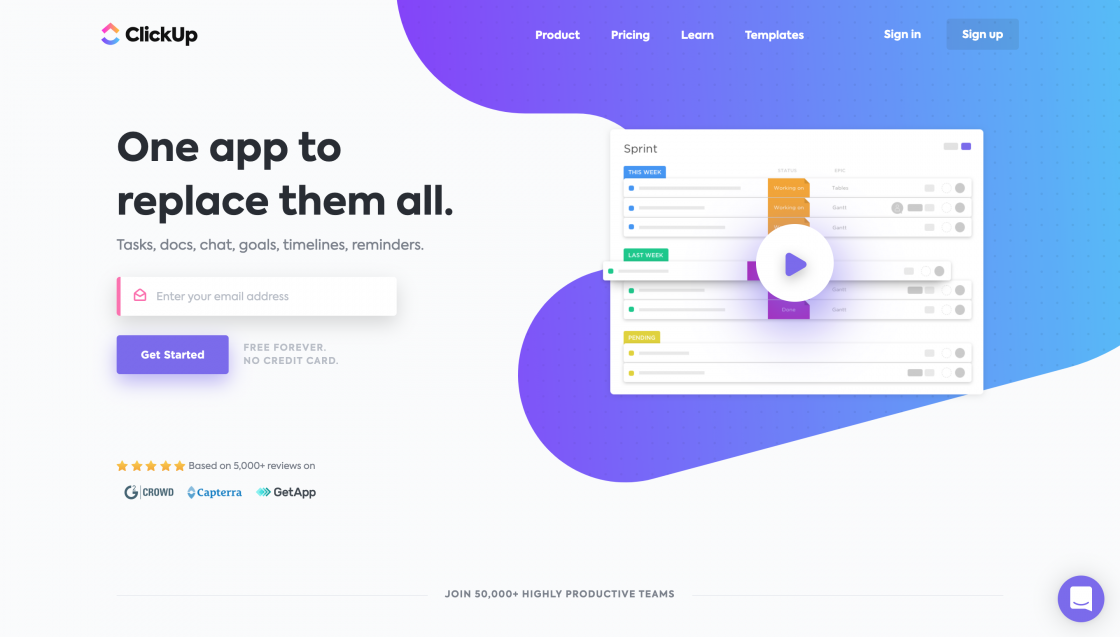 With ClickUp you can work on anything, with anyone. Think of ClickUp as Asana + Notion + Airtable + Jira + Slack. Tasks, Chat, Goals, Docs, Reminders, Inbox, Spreadsheets, Time tracking, Timelines, 50+ proprietary features like Task Tray, all in one single place.