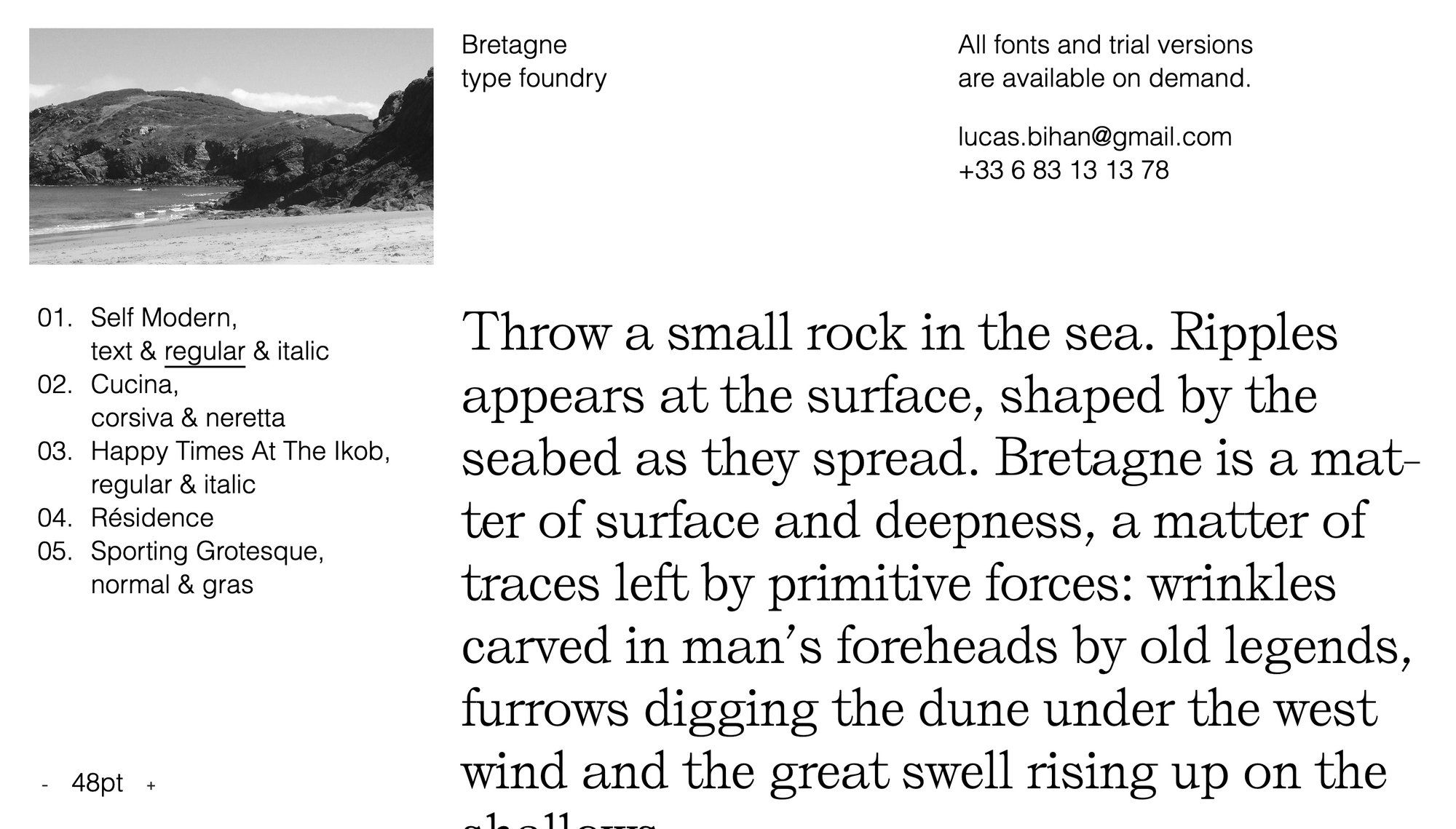 Self Modern is a serif typeface designed by Lucas Le Bihan and published through Bretagne in 2016. The family is available in text, regular and italic styles.