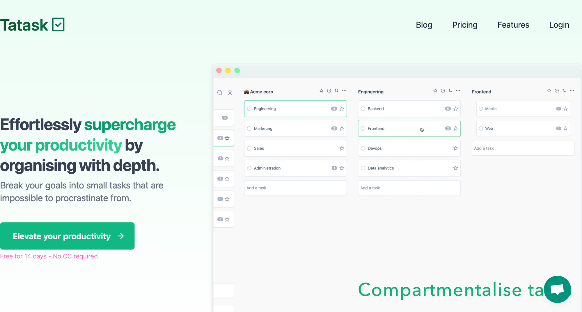 To achieve your biggest goals, it makes sense to break those down into smaller tasks, since smaller tasks are basically impossible to procrastinate from. Tatask is a tool that helps you to effortlessly supercharge your productivity by organizing with depth.