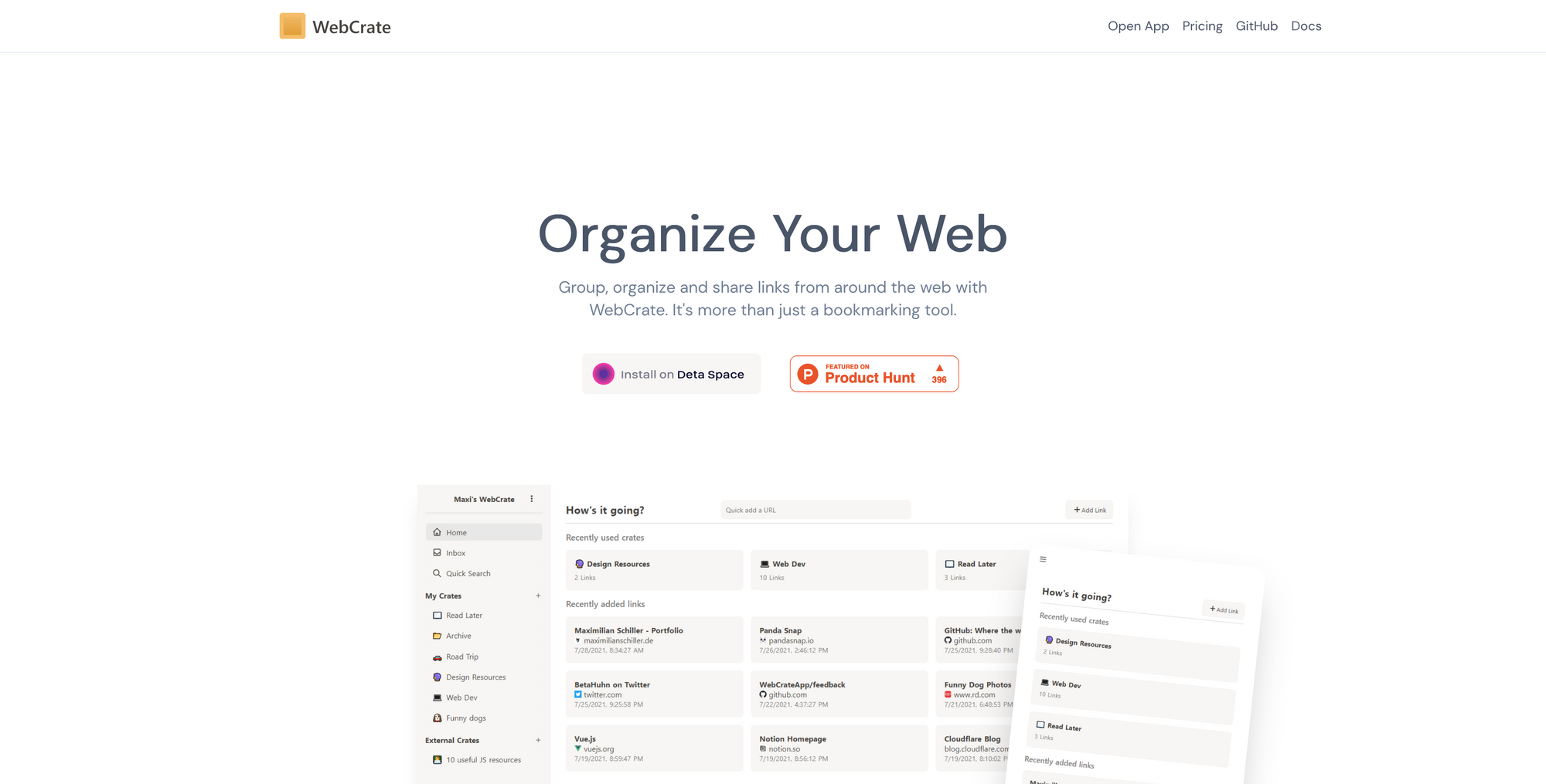 At the core, WebCrate is a tool to gather, group, organize, and share links from all over the web. But at the same time, WebCrate is more than just yet another bookmarking tool. First of all, WebCrate runs on Deta Space, which is a new personal cloud that gives you the possibility to create your own personal computer in the cloud, to run your own apps. All apps you find and use on Deta Space run in your own sandboxed 'personal cloud'. That means that only you have access to your data. Therefore, WebCrate might be the most secure and private bookmarking tool out there.