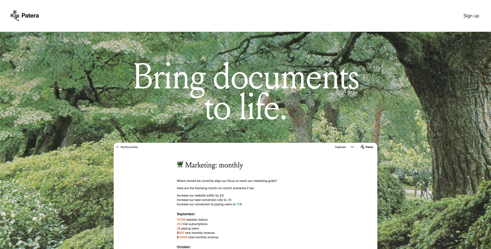 Patera is a new environment for teams. It is a space to think, plan, and model scenarios. With Patera you can get rid of boring static sheets and bring in dynamic documents. Patera gives you the power of excel syntax so you can explore possibilities, outcomes, and alternatives, it feels like a spreadsheet you can actually read. At the core, Patera is a new way to create documents, but if we take a closer look, Patera is offering unique features to create dynamic documents for active readers.