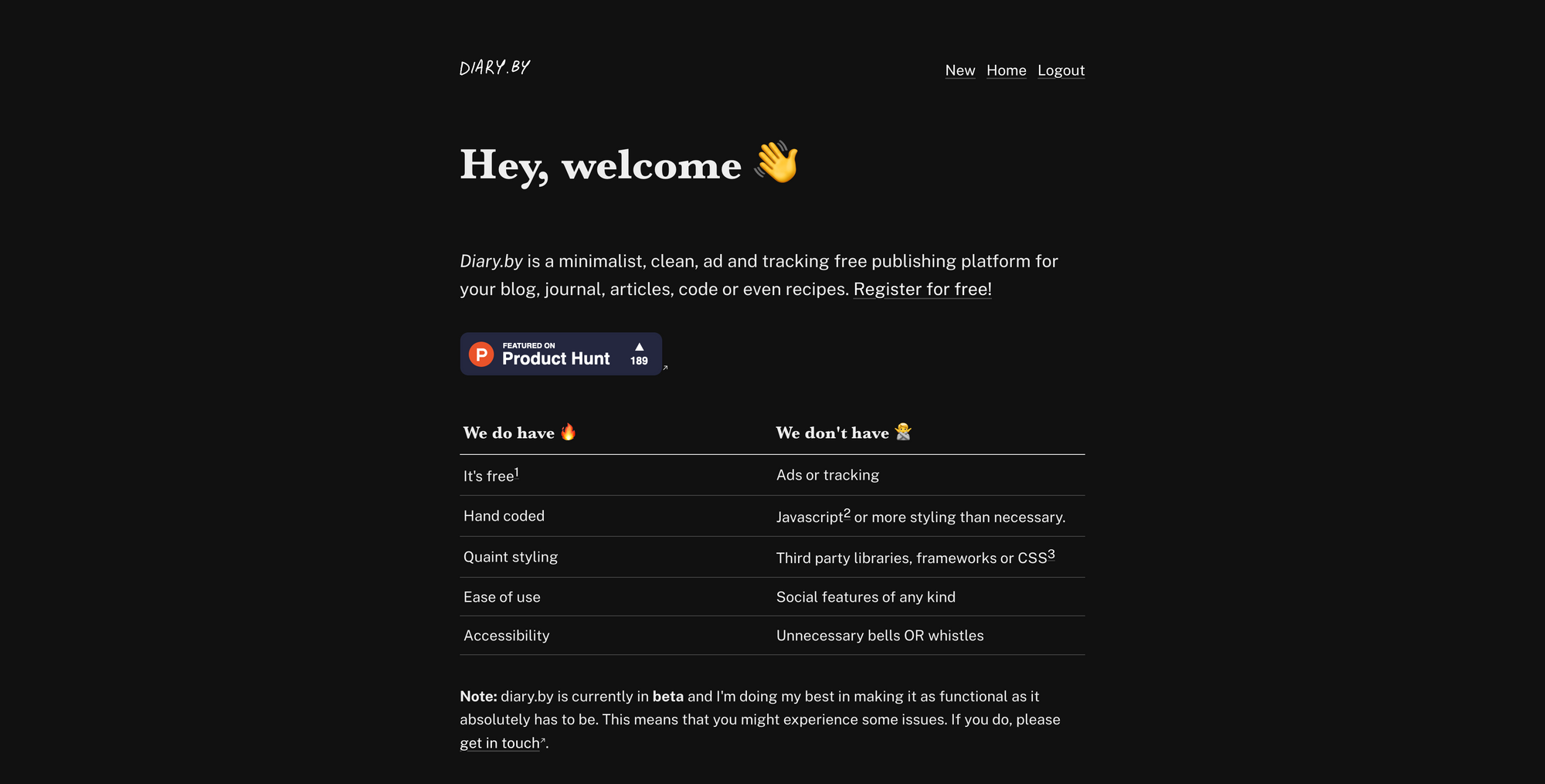 If you want to support the maker and the development of the service, you can do so by becoming a patreon. In return, you will receive access to some extra features, like image upload and custom css. Diary.by is a super simple, lightweight, and minimal platform, which gives you a distraction-free interface and a beautiful and minimal blog page to showcase your writing. We often forget, that for most use-case we do not need to set up databases for simple and personal blogs for example. All you need is a distraction-free writing experience, and a simple and lightweight way to display and showcase your writing.