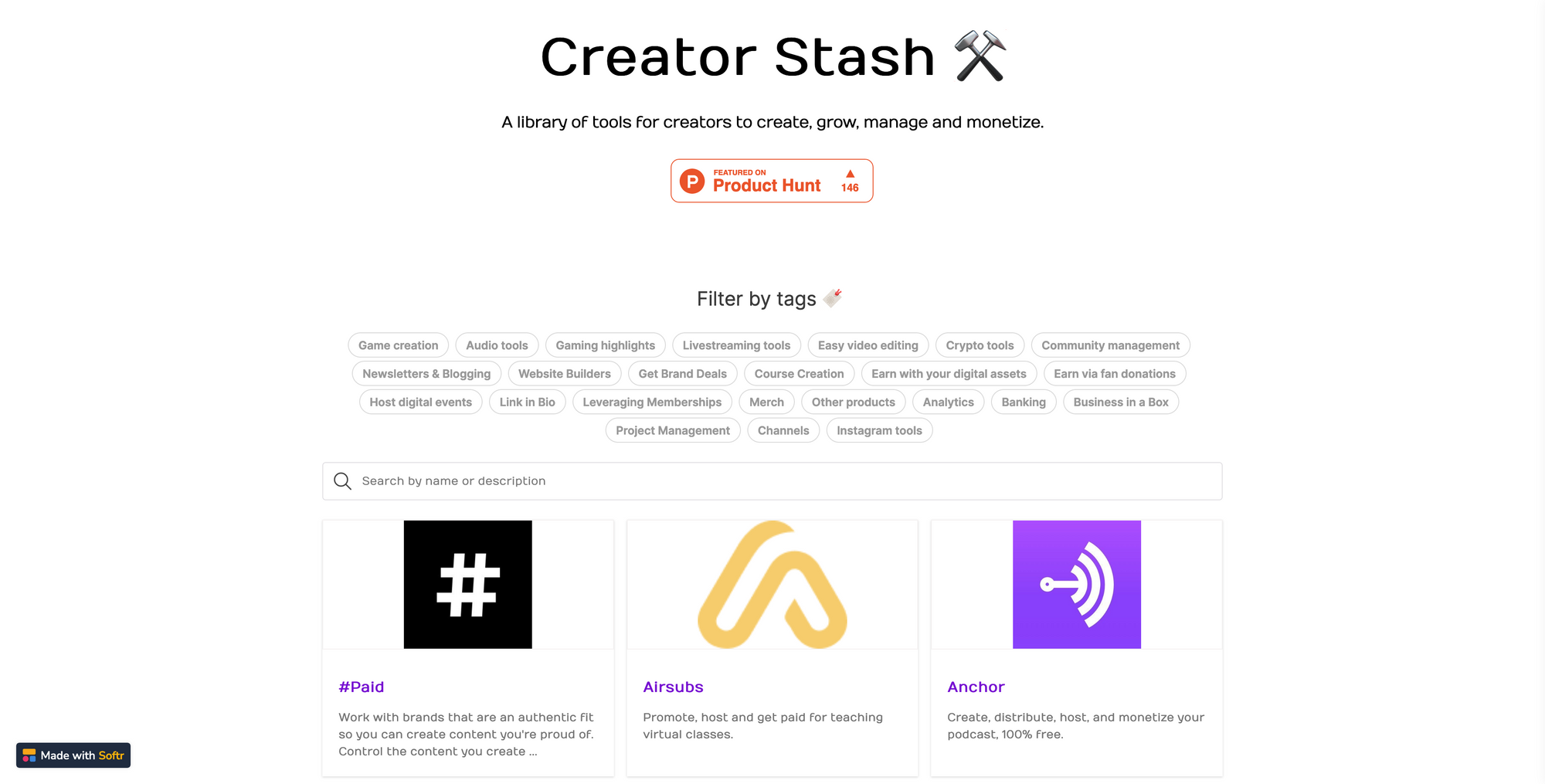 Creator Stash is a superb library of over 300 products and resources especially aimed at content creators to help them with creation, growth, management, organization, and monetization. Within Creator Stash you have the possibility to filter all the products and resources by tags based on your goals, but you can also search by description. No matter if you are searching for resources regarding newsletters and blogs, audio, live streaming, or community management, Creator Stash got you covered.