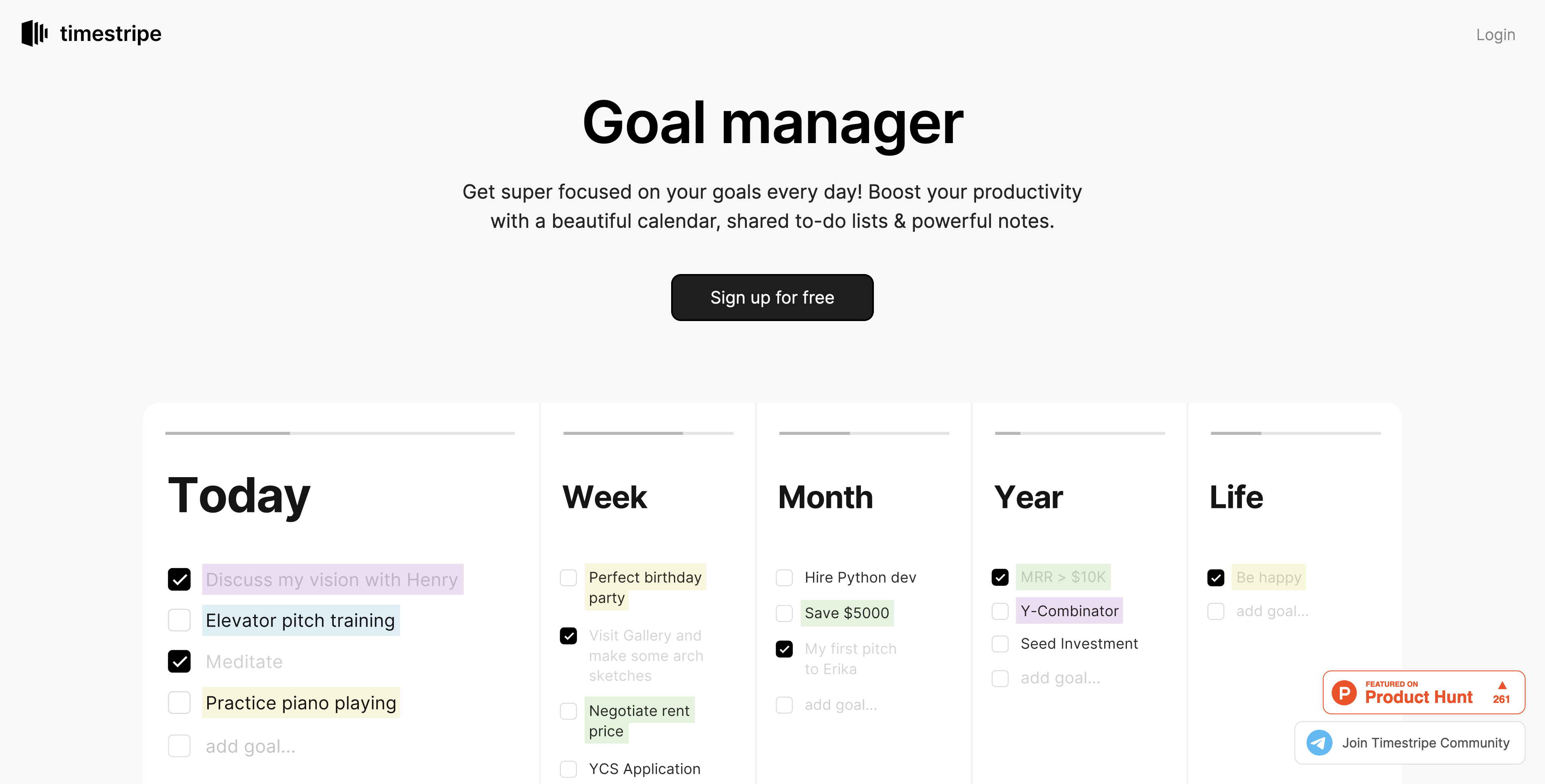Timestripe is a full-fledged goal planner and time management tool, that gives you awesome features like a beautiful calendar, shared to-do lists & powerful notes, to boost your productivity while always staying on top of your goals, getting a clear vision of what to focus on next. If you ever wanted to use a planner tool with flexible timeframes to strategically plan, have a clear vision, and be able to focus on things that are actually important to you, you should give Timestripe a try.
