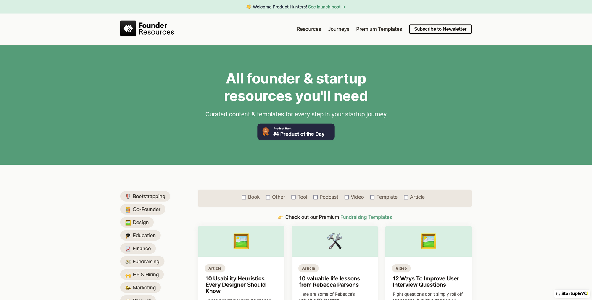 FounderResources is a huge library and curated list of over 500 resources, templates, and tools that help you as you are starting your journey of building your next project and aiming to turn it into a business. The library is beautifully structured with different categories, so you can easily browse all the entries and find what you are looking for. No matter if you are searching for resources or tools for marketing, finance, design, fundraising, remote work, or anything else, FounderResources got you covered.
