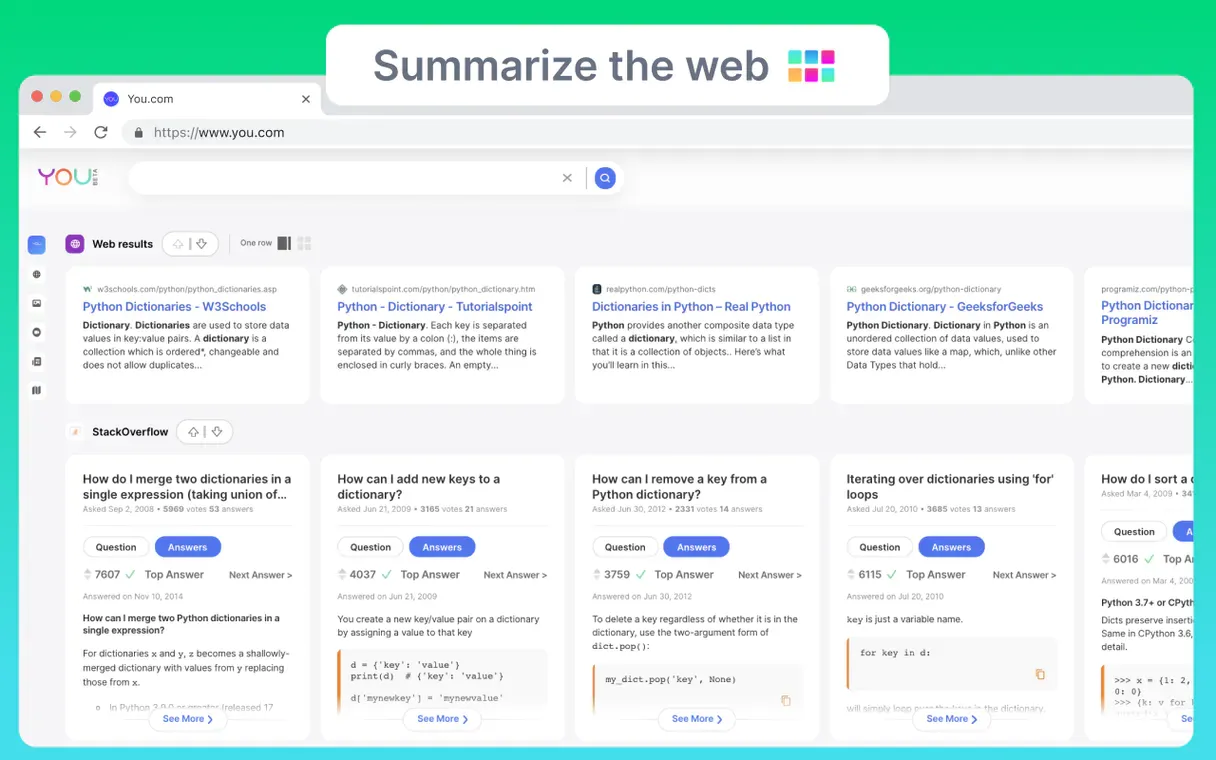 Each of the rows presented after you executed a search with You.com represents one search app. These apps form an interface to your digital life. While using You.com is totally up to you to choose between a customized search experience or an entirely private one. If you want, you can use You.com's private mode which offers the most private search experience, as You.com never stores your queries, preferences, or locations. Besides You.com's awesome privacy-related features, it also features a beautifully designed interface you have never seen before while using any other search engine. The future is private, and You.com is here to help you stay private and never share any data while searching the internet.