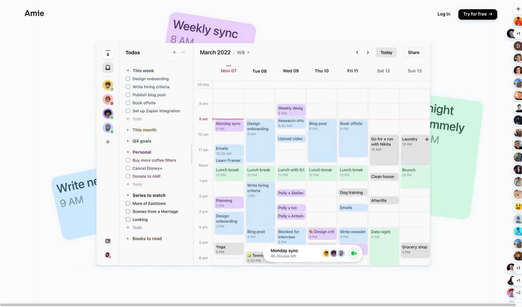 Amie makes it incredibly easy to share your availability with your colleagues, teammates, clients or anybody else. On top of that, if you share a link to your availability, the receiver will get a beautiful page to book a slot with you. If you ever struggled to keep up and remember the personal things and birthdays of your family and friends, Amie lets you set up reminders for those so you never forget anything. With Amie, any action is just a few keystrokes away since there is a command bar that gives you the possibility to quickly search for dedicated events or quickly create new todos. In general, Amie offers shortcuts to duplicate, join calls, and much more. If you are working across a remote team, Amie lets you easily set multiple timezones and team calendars.