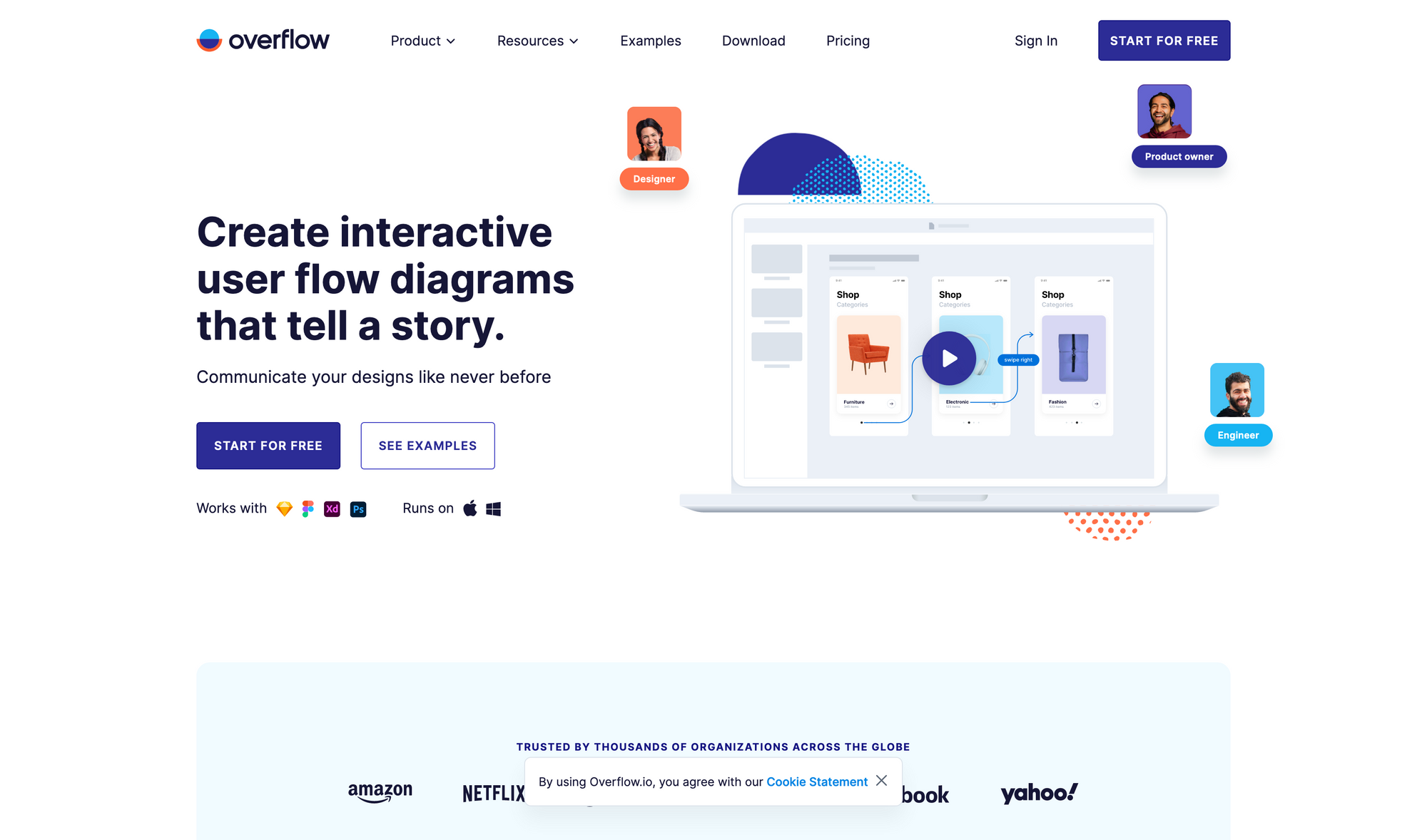 Overflow is a tool to create interactive user flow diagrams that embrace the communication of your designs like never before. When working on new user flows it is important to communicate your ideas, thoughts, and the interaction you have designed. Overflow gives you the possibility to create interactive user flow diagrams and design presentations with ease and speed.