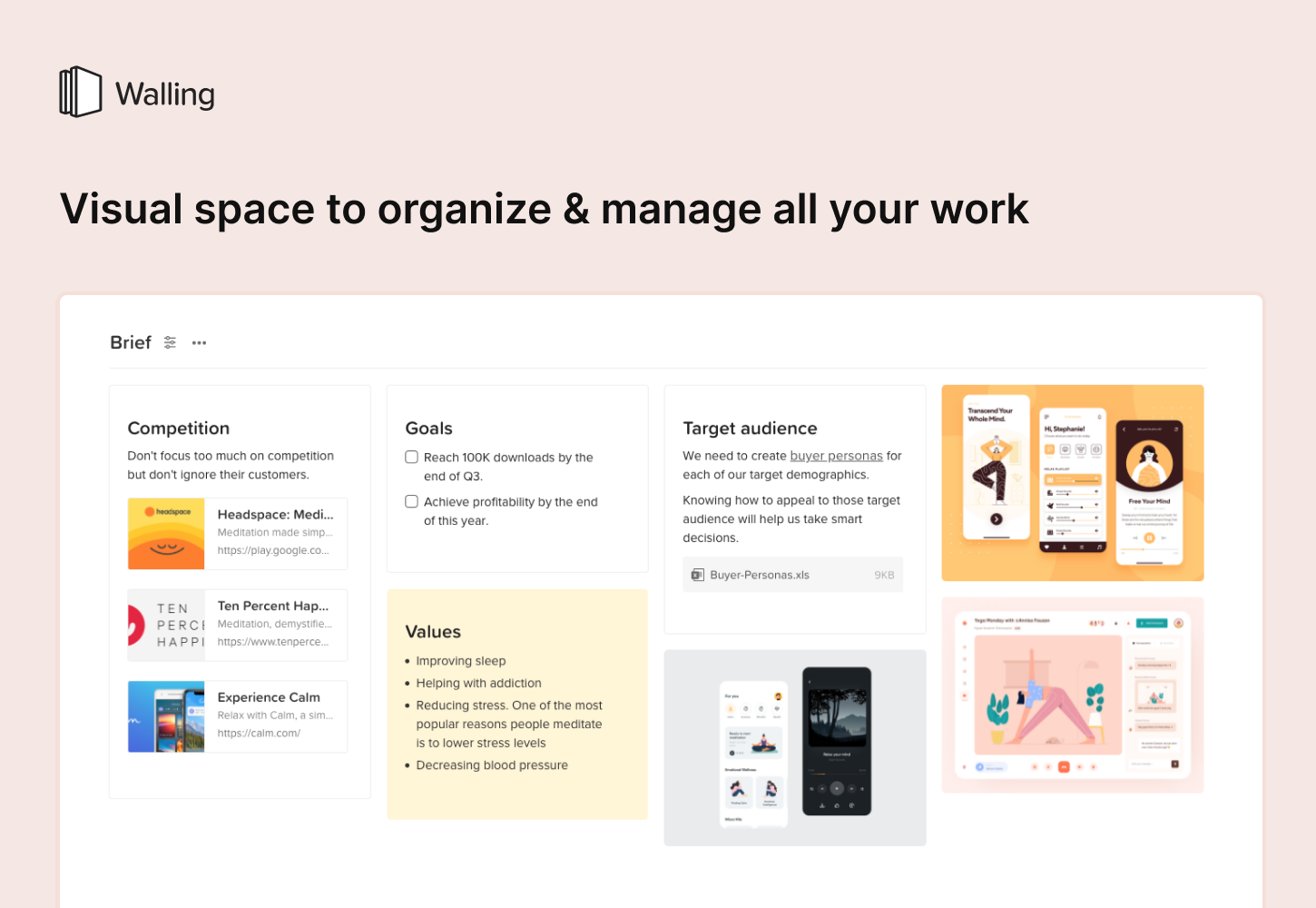 Drowning in ideas and tasks? Meet Walling, a visual tool to organize all your ideas, tasks and inspirations, side-by-side, all in one place. Get a birdâs eye view of your entire work to see clearly what needs to get done and what is important to your projects. Try Walling For Free!