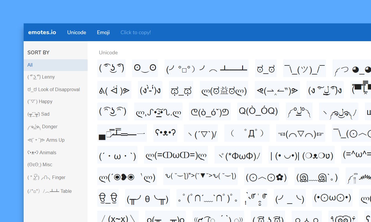 All of your favorite emotes in one page. Including unicode emoticons and emojis. Simply click to copy, then paste anywhere! â Useful when you want to add a Lenny face ( ͥ° ÍĘ ÍĄÂ°), shrug ÂŻ\_(ă)_/ÂŻ or donger á(ಠçಠá) when chatting with your friends.