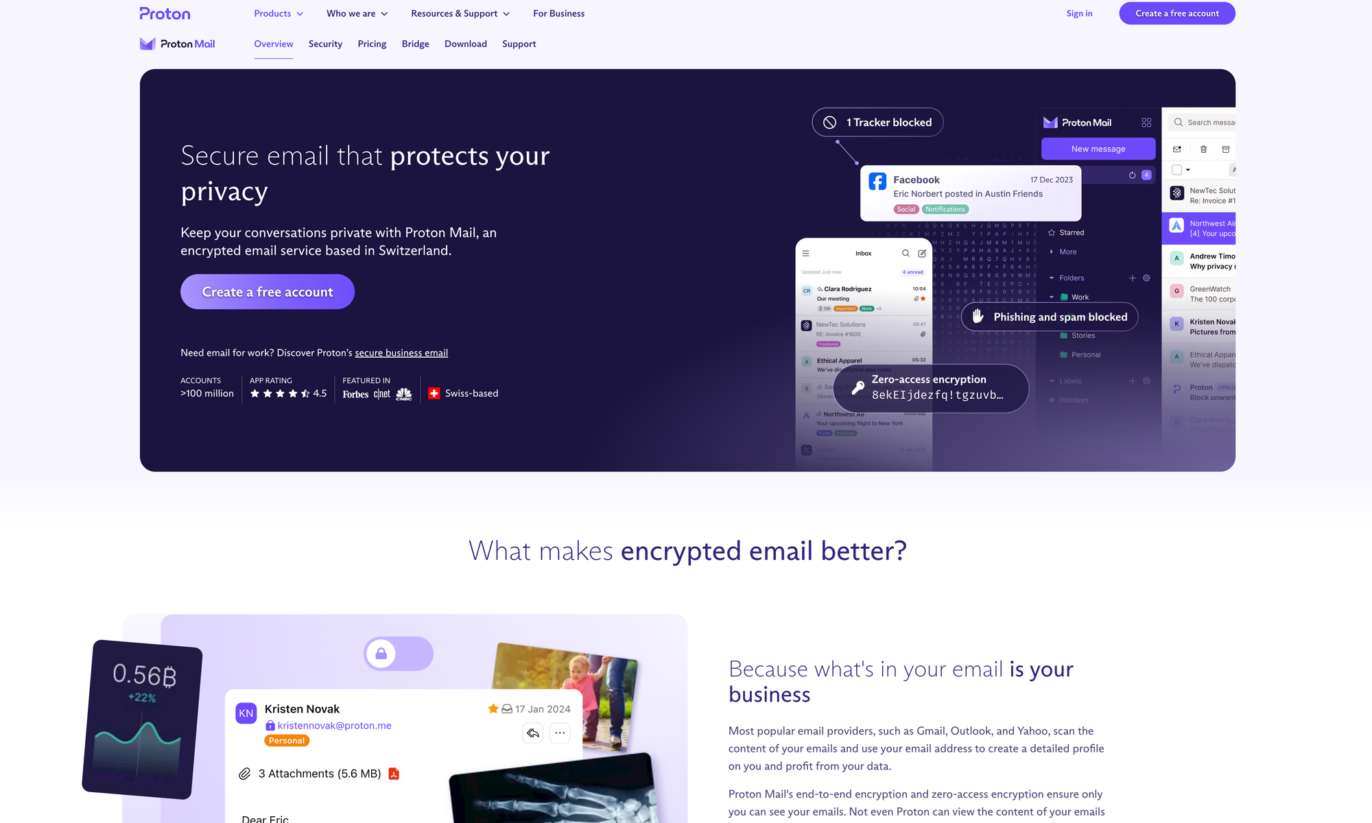 Proton Mail is one of the most popular privacy-focused Gmail alternatives. End-to-end encryption, headquartered in Switzerland, email tracking blockers, and over 100 million accounts are some of the strong arguments speaking for Proton Mail. Gmail, Outlook, Yahoo, and other popular email services use your data to profit from it. Instead, Proton Mail with its end-to-end encryption and zero-access encryption ensure only you can see your emails. Not even Proton can view the content of your emails and attachments.