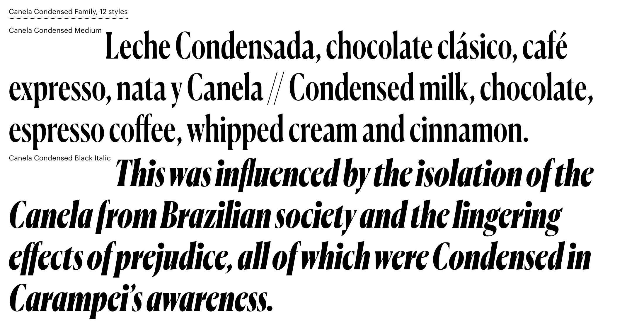 Canela is a display typeface designed by Miguel Reyes and published through Commercial Type in 2016. Reyes began Canela as an interpretation of William Caslonâs display faces but deviated from there into a design that is neither purely a sans-serif nor a serif. The flared stroke endings, which were inspired by his experience with stonecarving, lend the typeface an inscriptional quality. Canela is available in six weights with matching italics. Two new optical sizes, Canela Text and Canela Deck, were added to the family in 2018.