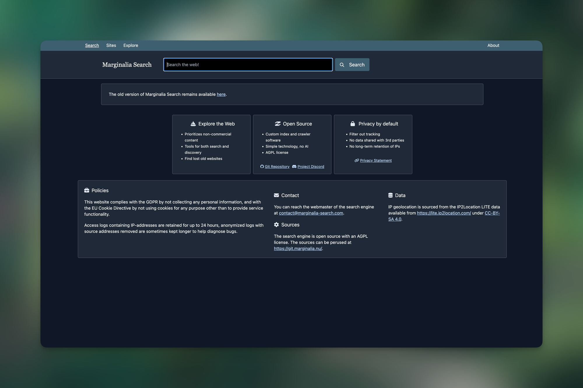 Marginalia is not seeking to replace corporate searches like Bing or Google, but its goal is to complement them to provide a minority report that keeps them honest. It prioritizes non-commercial content, provides tools for both search and discovery, and helps users to find lost old websites. Marginalia is powered by a custom index and crawler software, which is also open source. By default, when using Marginalia it filters out any kind of tracking, no data will get shared with 3rd parties, and there is no long-term retention of IPs.