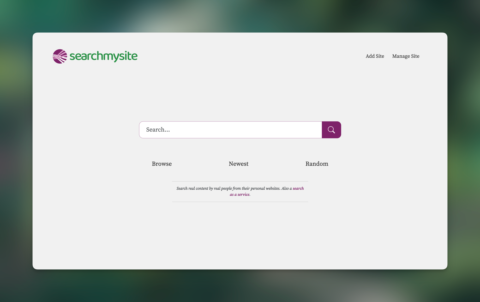 Searchmysite.net is a boutique search engine for personal websites, in order to discover and browse through the indieweb. It resurfaces people's personal experiences of certain topics, hobbies, and interests. All the sites that have been indexed by searchmysite.net have been manually submitted by users. So, instead of indexing the entire internet with all its spam and AI slop, search engine optimizations, and click-bait content, searchmysite.net shows you websites that really matter.