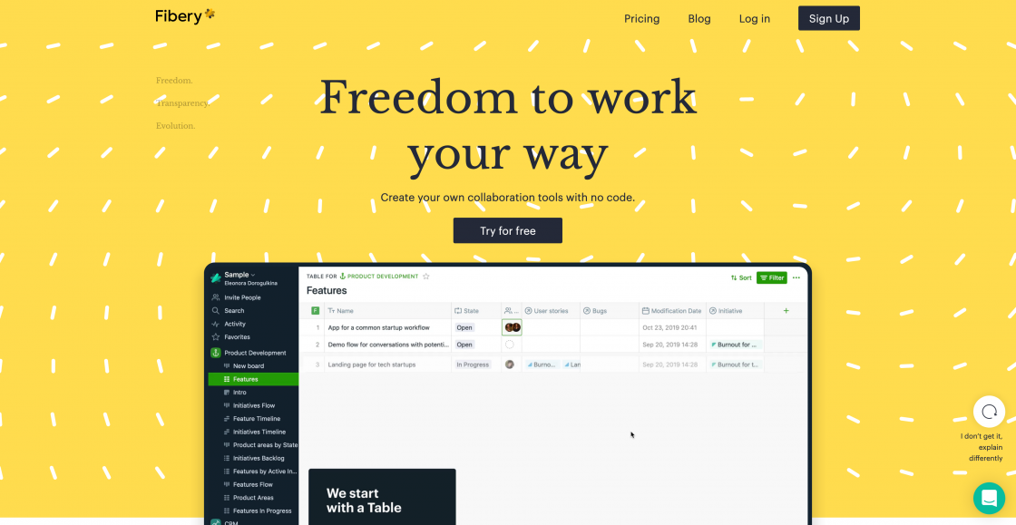 Create a workspace that brings teams together: sales, marketing, product, R&D. Escape costly scattered tools and unreliable integrations by having goals, projects, customers, and docs connected in Fibery.