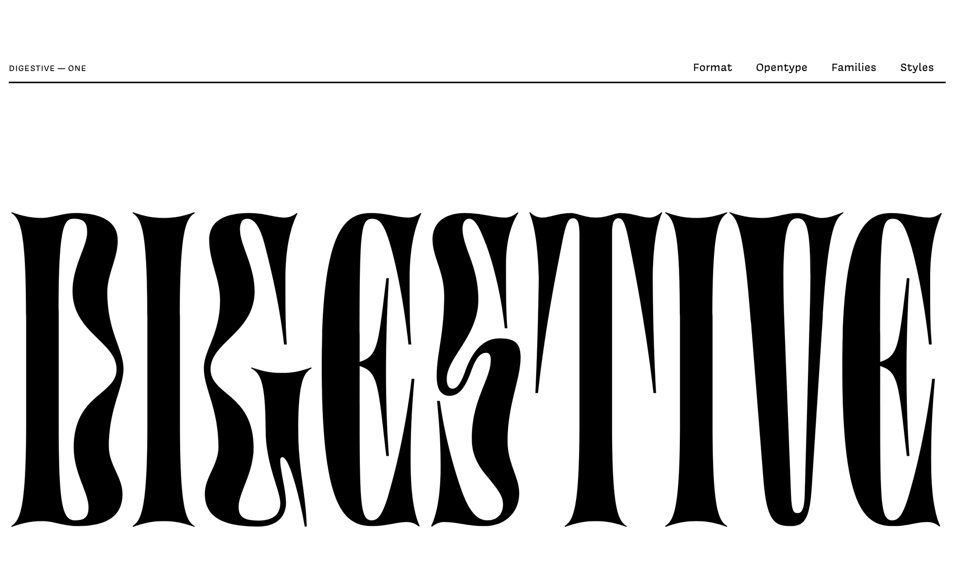 Digestive is an experimental display face designed by JĂŠrĂŠmy Landes. It began its life in 2016 as a lettering project and was later released as a work-in-progress on the Future Fonts platform in 2018. The completed typeface was published in 2020 through OH no Type Co. The family is available in six widths, as well as a small style that was designed to be more legible at text sizes.