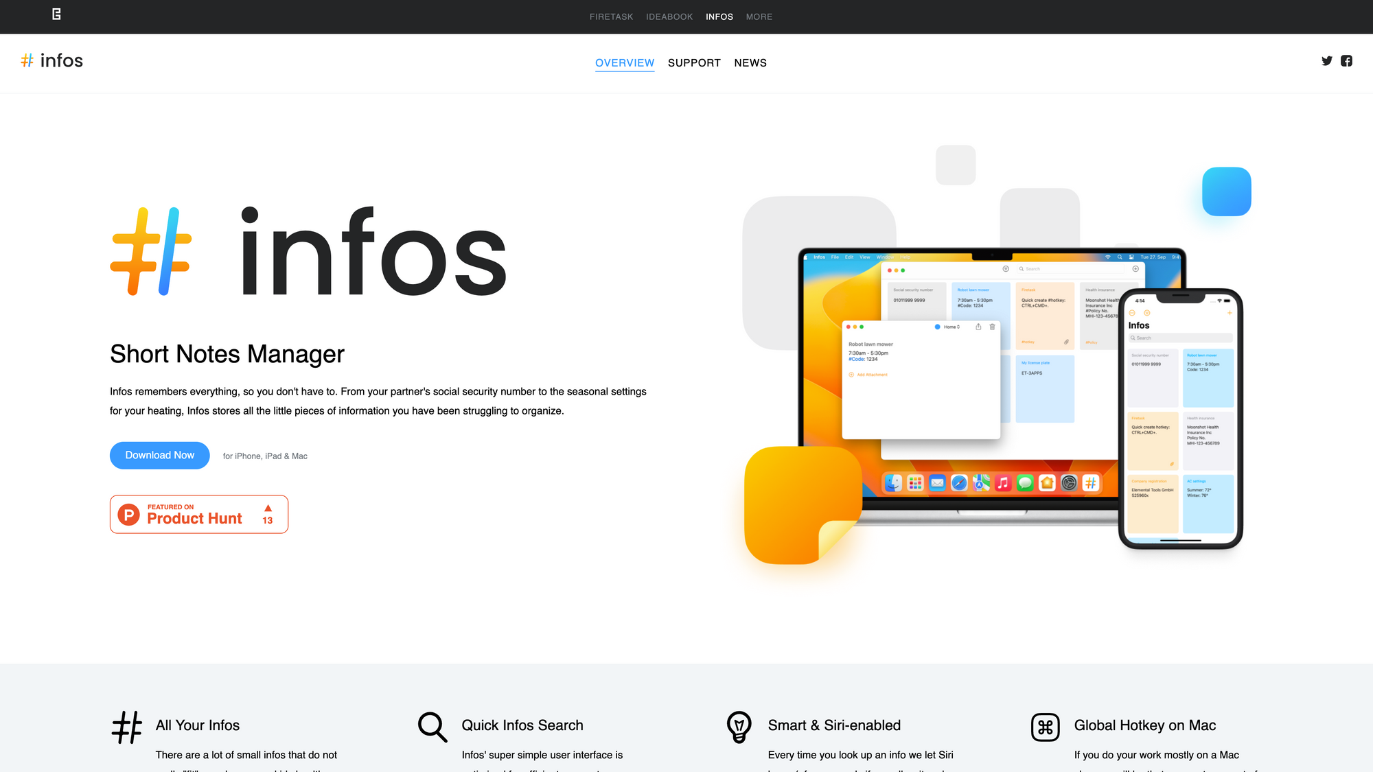 Infos is a short notes manager by Elemental Tools, the company behind other awesome apps like Firetask and Ideabook. Infos remembers everything, so you do not have to. No matter what kind of information you want to remember, Infos was built to give that kind of bits a home and structure and organise them in a nice and clean way. Most of us probably stumble across a lot of different informational bits every single day. At some point, you will find yourself in a situation where you are unsure where to put and store that kinds of bits. With Infos you no longer have to think about where to put it, simply open the app and store your short note. Infos was created to let you store information pieces in a fast and intuitive way while intentionally providing only minimal ways to organise them. This keeps things really simple. The only two ways to organise your short notes in Infos are tags and categories. You will quickly realise that you do not need additional organisational layers, especially for short and quick notes.