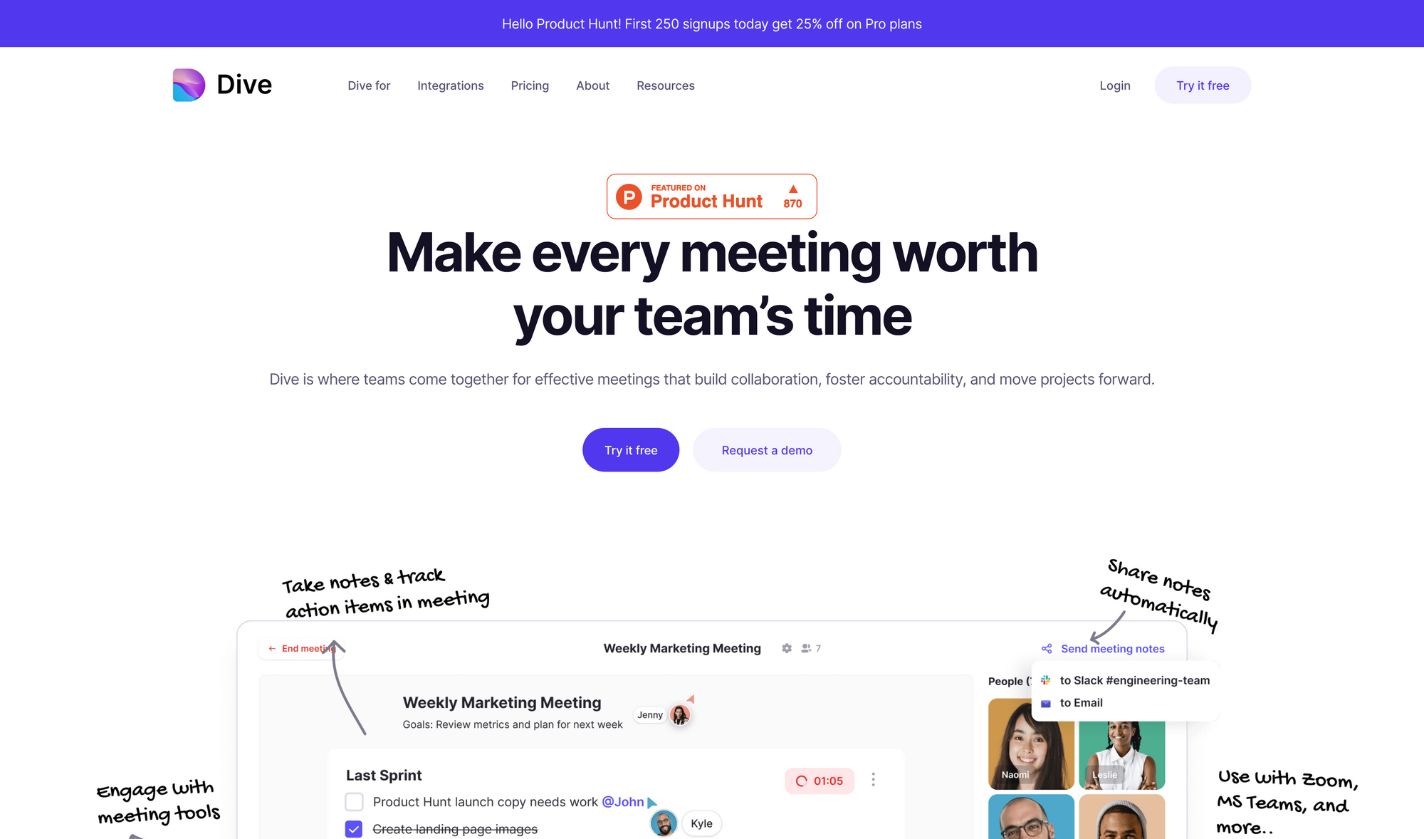 Dive is a tool that boosts your meetings so you can make every meeting worth your teamâs time. The goal of dive is to bring teams together to hold effective meetings that build collaboration, foster accountability, and move projects forward.