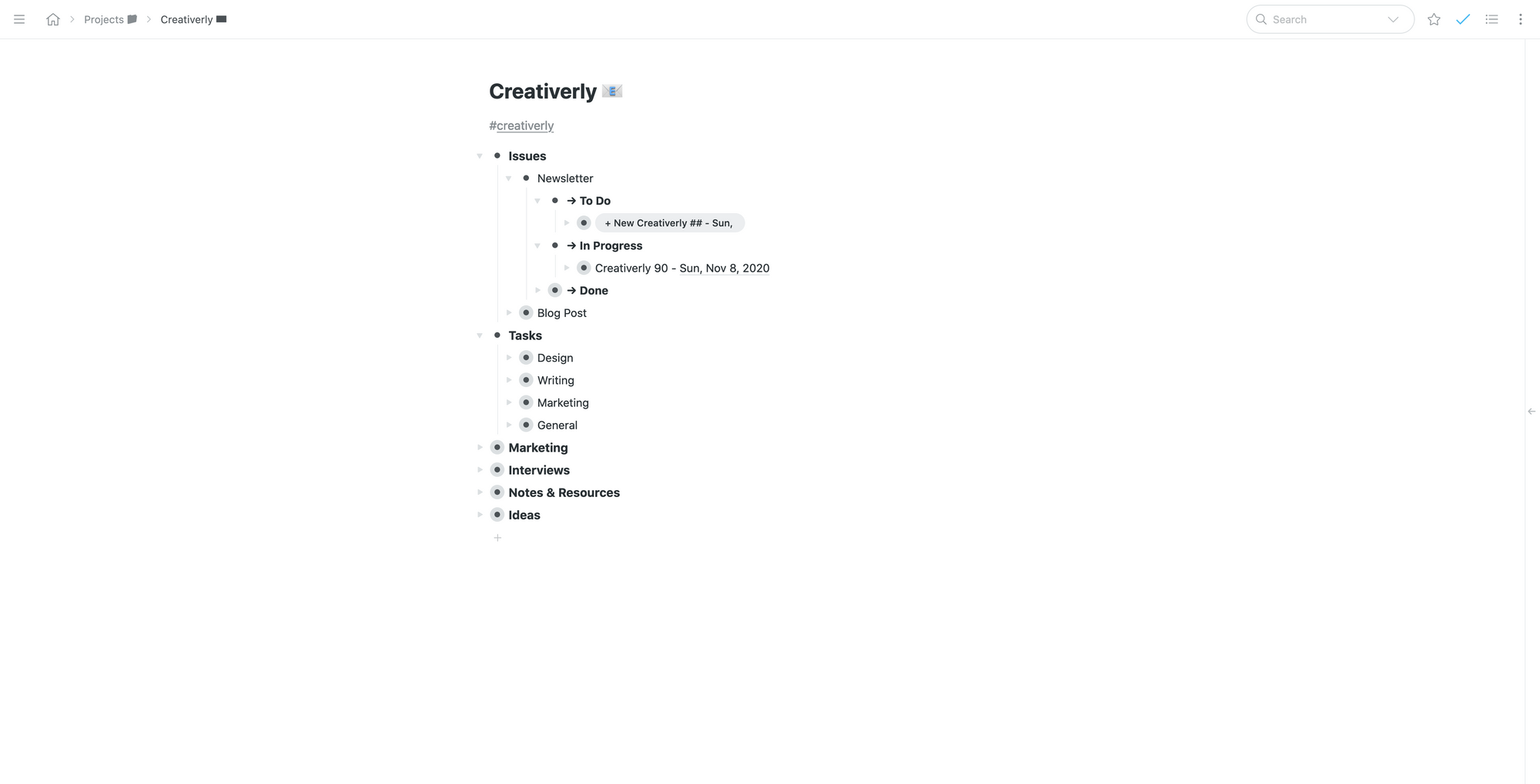 I set up a personal dashboard as my „home page“. From their I have access to some bullets, which act as links to more pages. So, for example I got a bullet named „Projects“. Clicking on that bullet brings me to a new „page“ with bullets named after my side-projects. One of them is Creativerly. Clicking on that bullet brings me to my „Creativerly Dashboard“ where, again, I set up bullets acting like links/headlines. I got one for Issues (where I outline each Creativerly Issue), one for Tasks (although I moved most of the workflow from this bullet to Todoist), one for Notes & Resources, and so on.