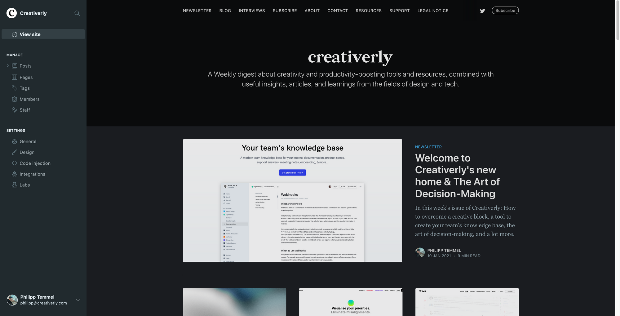 I am going to break down this article into different sections. On one side, I am going to talk about the operational side, which means hosting, domains, and that kind of stuff. On the other side, I am going to dive in deep how I curate, which tools I use, how I structure and organize my work and tasks, and how the overall project management behind Creativerly looks like. The first part will be about my workflow and the tools I use, and the second part of this blog post will be about the more technical stuff, regarding hosting, ESP, domains.