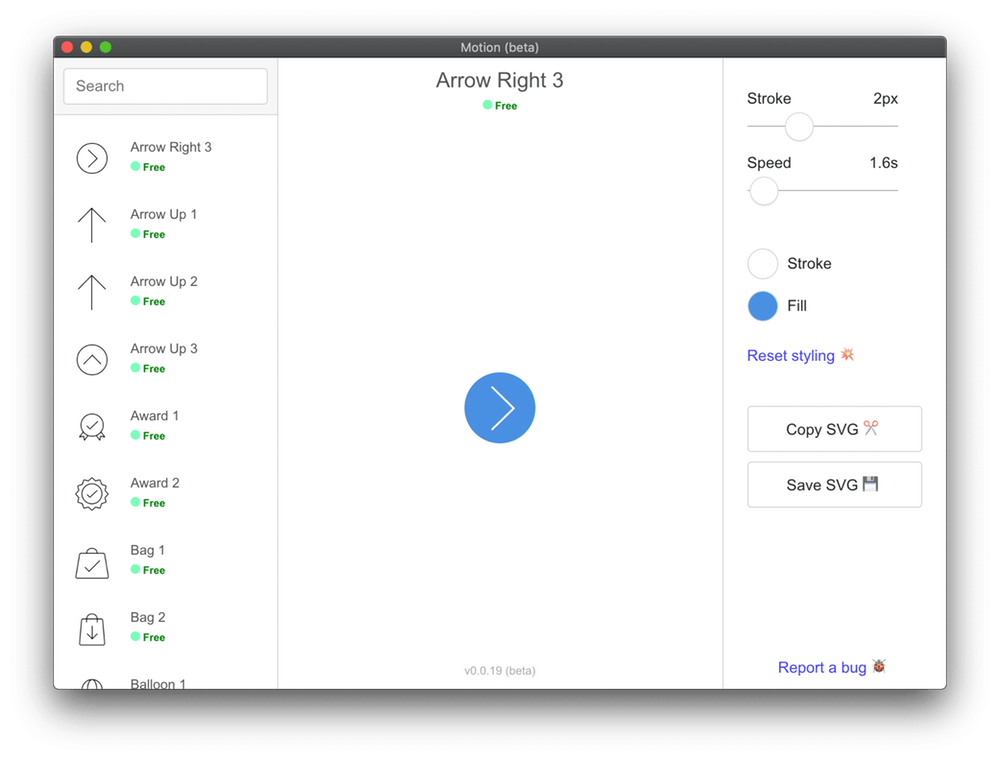 Motion is an animated icon editor! It lets you quickly find an icon you like, made some tweaks and adjustments and plug it into whatever project you are working on! There are hundreds of icons to use and it's free!