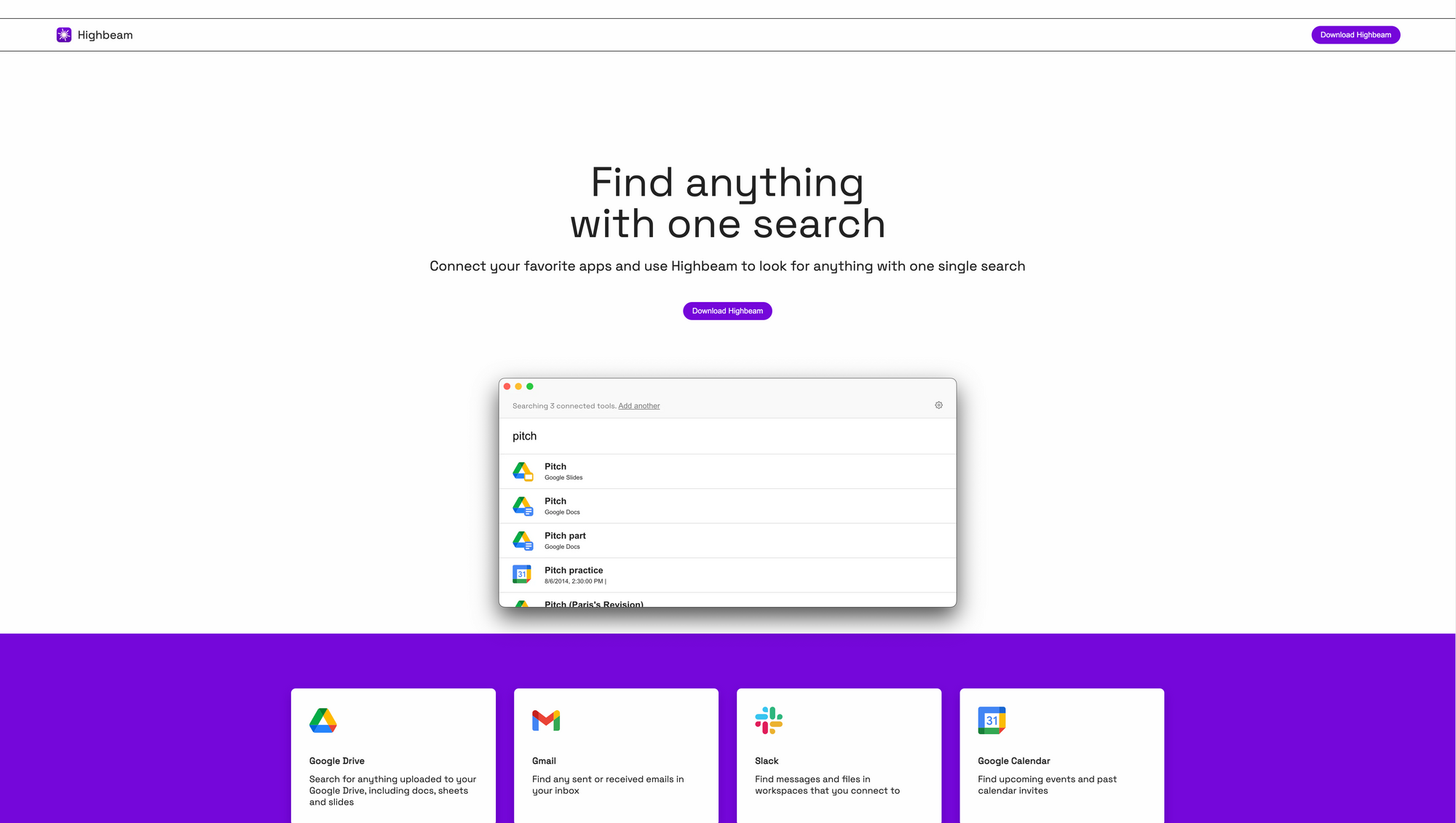 Recently, I stumbled across Highbeam, another app that wants to help you finding anything with just a single search. Highbeam lets you connect the apps you are using on a daily basis, to look for anything with a single search input. As of writing this, Highbeam supports integrations for Gmail, Google Drive, Slack, and Google Calendar, but according to Highbeamâs website integrations for Notion, Confluence, GitHub, and Jira are also in the works. By connecting Google Drive to Highbeam, you get the possibility to search for anything that has been uploaded to your Google Drive, no matter if your are searching for docs, sheets, slides, or any kind of files, Highbeam helps you resurfacing the content and information you are looking for. With the Gmail integration, you can easily find sent or received emails from your inbox. The Slack integration of Highbeam lets you find messages and files within your workspace. The Google Calendar integration helps you finding upcoming events or past calendar invites. The upcoming integrations for Notion, Confluence, GitHub, and Jira will give you the possibility to search across spaces and pages, find documentations, look for repositories, and find issues, epics, and stories.