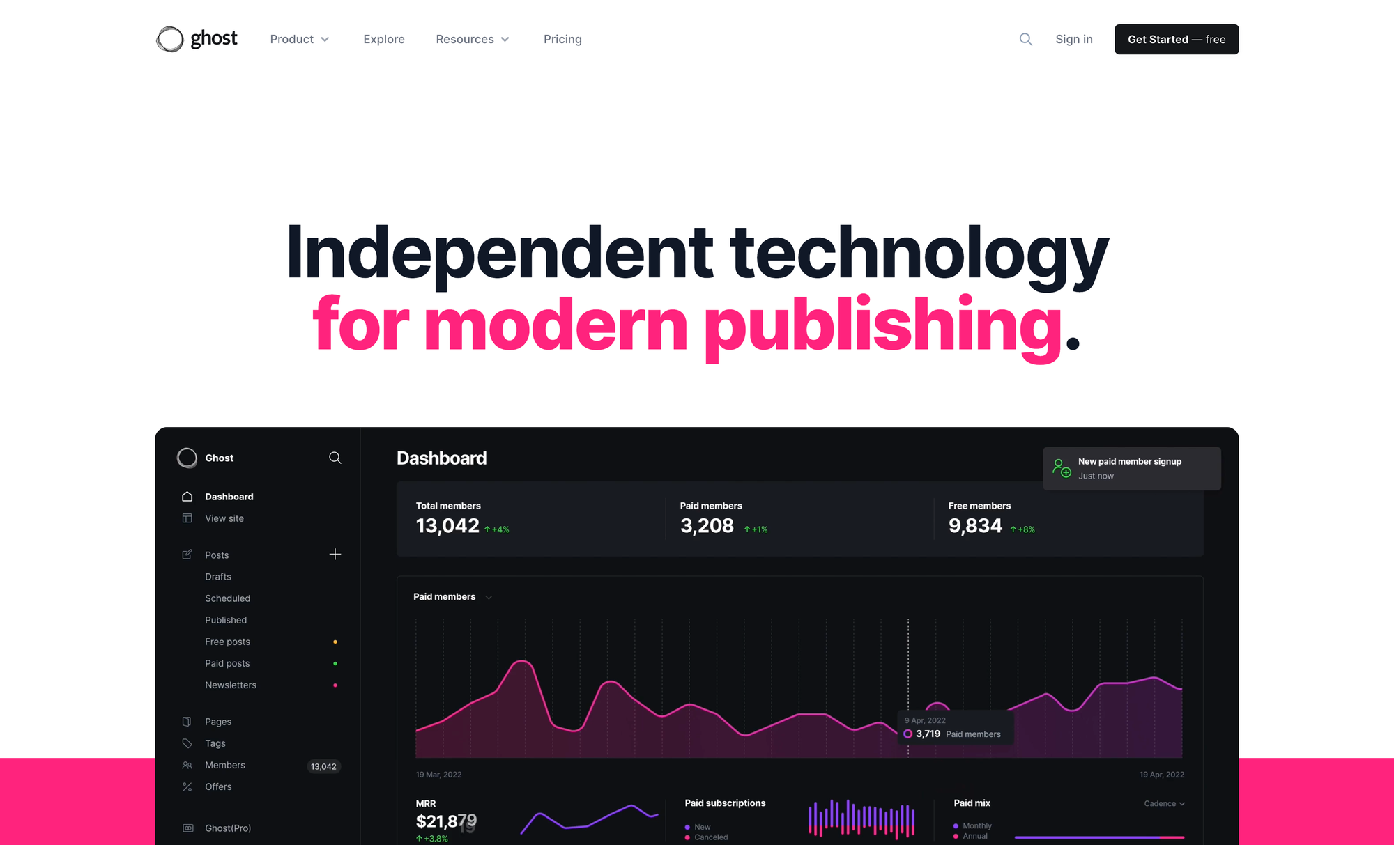 By using rich media and dynamic cards, Ghost allows you to expand your story with image galleries, gifs, video, audio, products, info boxes, accordion toggles, downloadable files, bookmarks, and much more. Ghost makes it easy to build and maintain an indie publication with memberships and subscriptions. People who are interested in your writing can sign up for free, or purchase a paid subscription to support your work across monthly and yearly premium tiers. The built-in membership management lets you see who has signed up, who is paying, and what they are reading. Native analytics which are accessible right within Ghost’s dashboard give you a clear understanding of what is working.