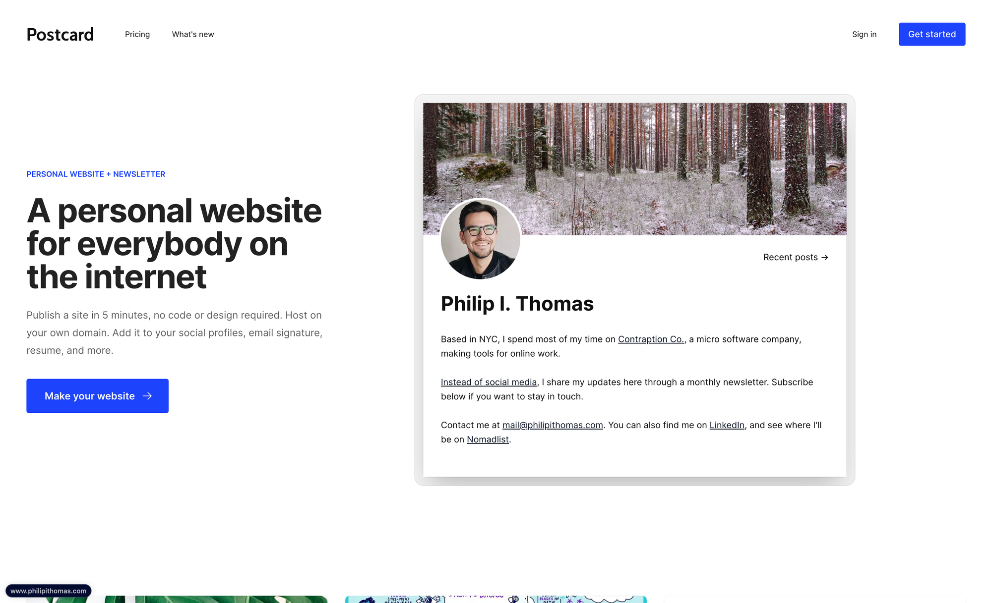 Postcard is a relatively new solution to build, set up, and publish a personal website as well as a newsletter for everybody on the internet. With just a few clicks, Postcard allows you to publish a site in five minutes, no code or design required. Host on your domain, add it to your social profiles, email signature, resume, and more, and you are good to go to publish your thoughts and ideas.