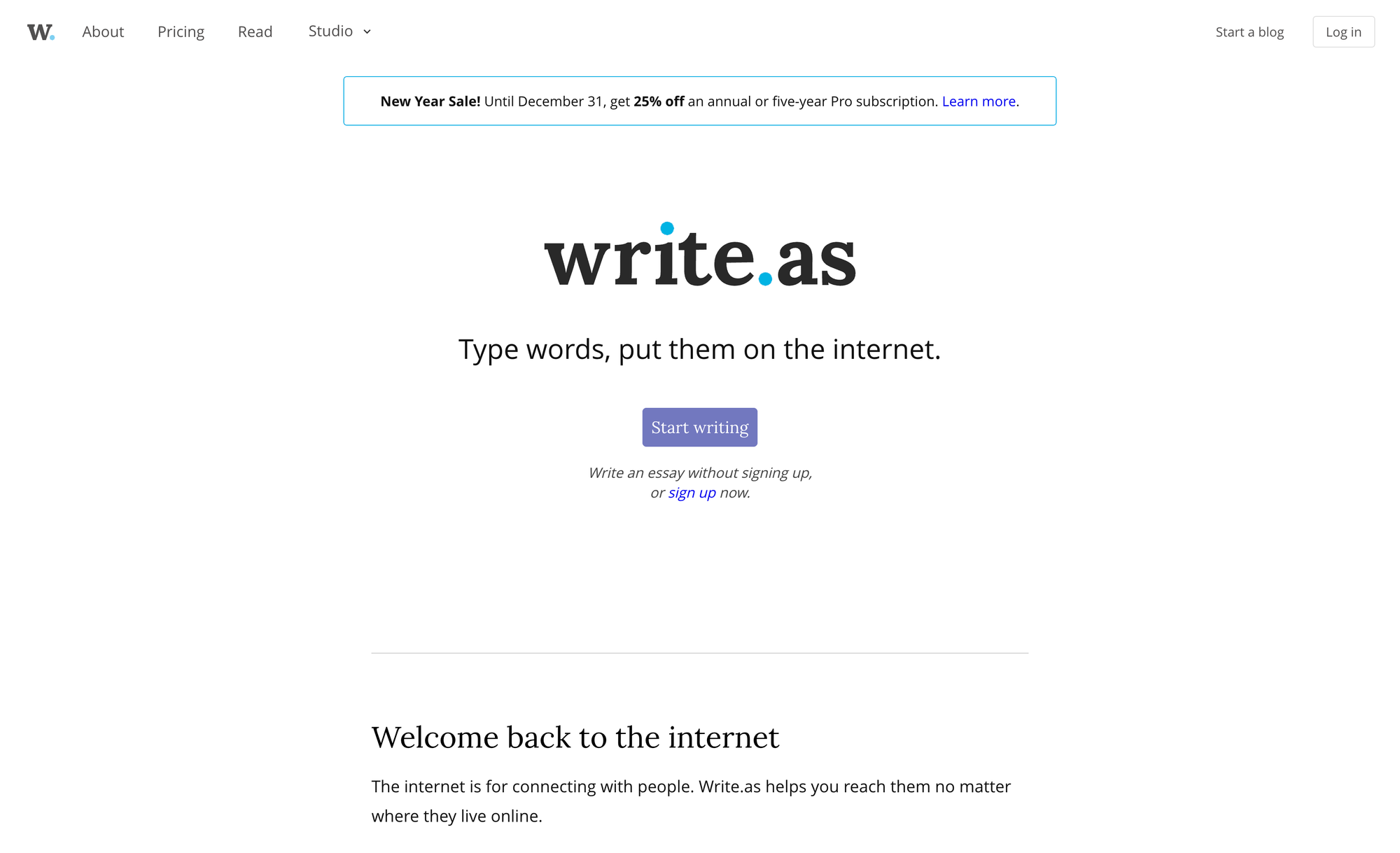 Thanks to Write.as’s Free Plan you can start a blog and instantly publish your writing without distractions. The Pro Plan, which lets you build a permanent, professional home for your writing, including custom themes, newsletters, photo hosting, and up to three blogs will cost you $4.50 per month (billed annually). With web monetization support, custom domain, newsletter subscribers, RSS feed, ActivityPub federation, and more, Write.as is ready to serve your publishing business.