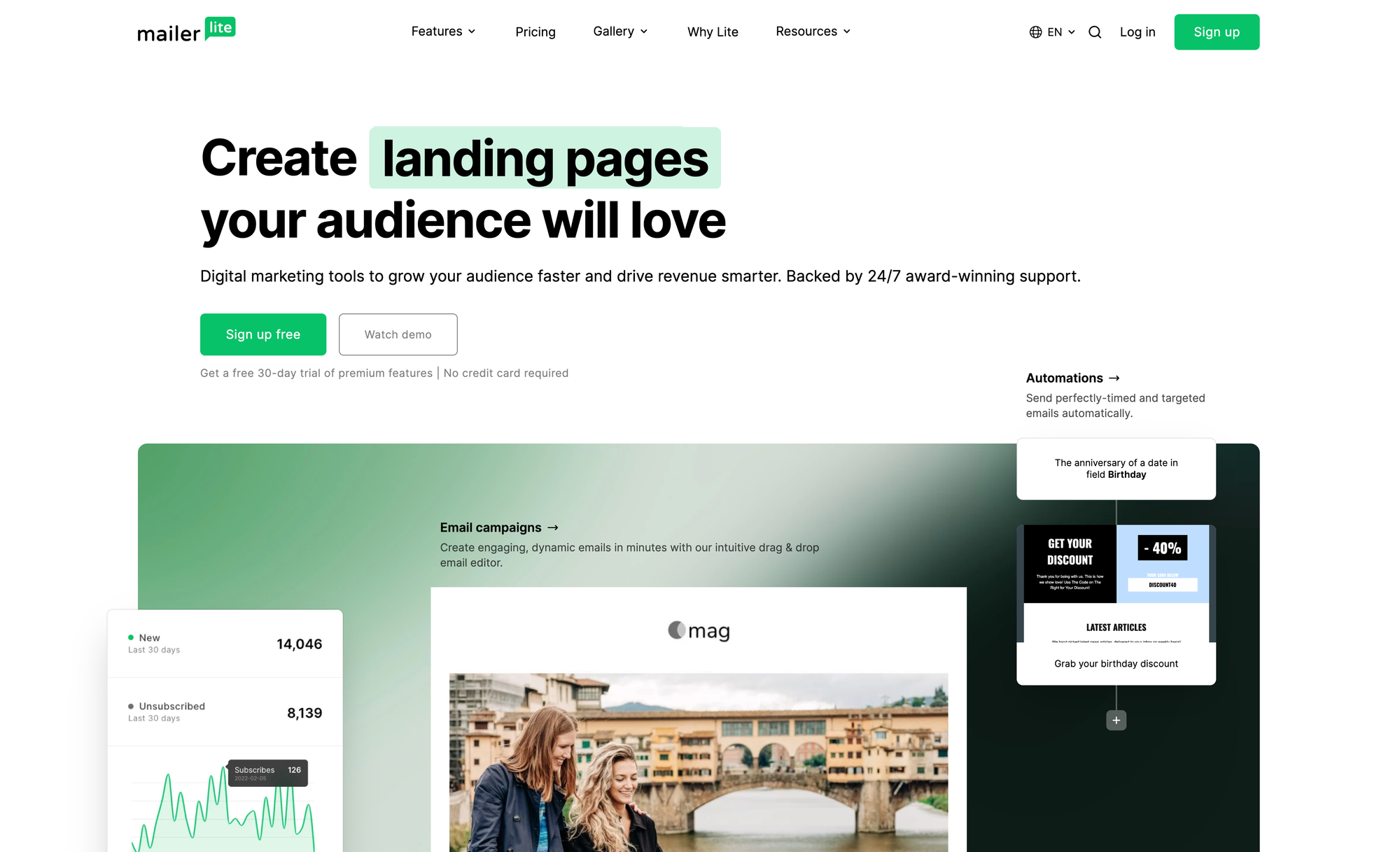 One of the biggest advantages of MailerLite is its outstanding customer support which is available 24/7, has a 5 min average response time on live chat, and holds a 97% satisfaction rate. Besides that, MailerLite offers a platform with a reputation for user-friendliness, rich customization, and fair and transparent pricing.