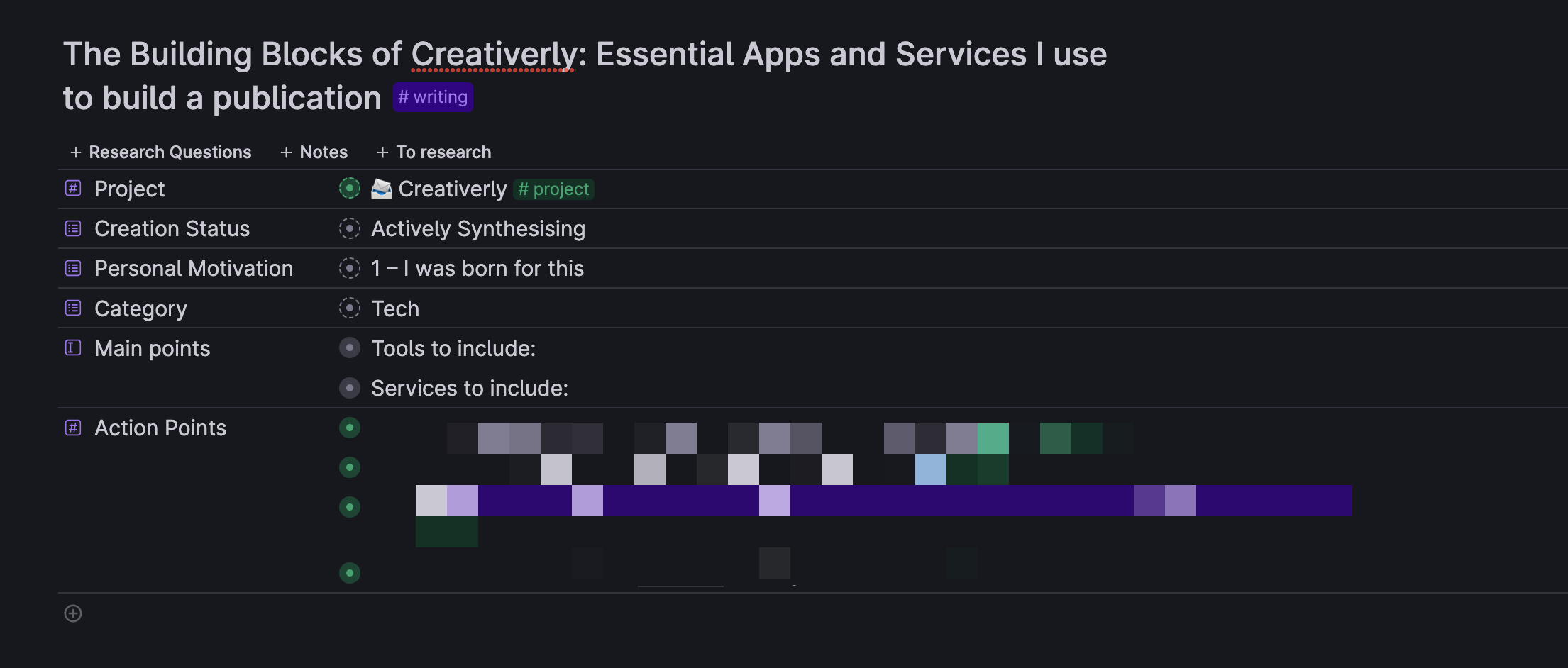 The Creation Status field has the following options: Idea Stash (the first stage in which I put all my ideas), Ambiently researching (which means I am not actively writing and producing content, but I am aware of the topic and add notes and questions to it over time), Actively Synthesizing (which is the stage in which I am actively working on the piece), and Alive and Public (which is pretty much self-explanatory, content that has been published receives that status). The Personal Motivation field gives me the possibility to assign the idea a priority up-front. The options include: 1 - I was born for this, 2 - A good idea, 3 - Meh. I am using this field as a prompt. If I have the feeling I was born to write about a dedicated idea, I know I am going to focus on it over the upcoming days or weeks. By assigning “3” as a priority, I know that I would like to keep track of the idea, but I will not get back to it anytime soon.