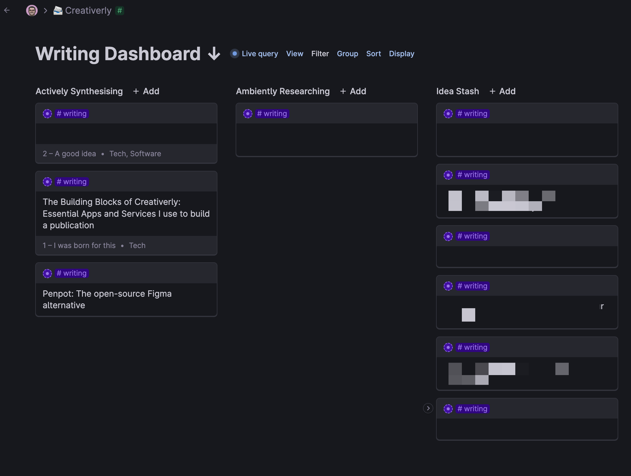 One of my favourite workflows within Scrintal is brainstorming, ideating, and exploring an idea or topic I would like to write about. As an example, let us take a look at the blog post you are currently reading, a deep dive into the apps, tools, and services I use to build and run Creativerly. The idea got born while I was jotting down some daily notes within Tana. As you know by now, I kept track of the idea by adding it to my writing dashboard with the #writing supertag. I then decided that this should get the highest priority, which means I started working on it once I came up with the idea. The next step of my writing process includes moving my idea to Scrintal.