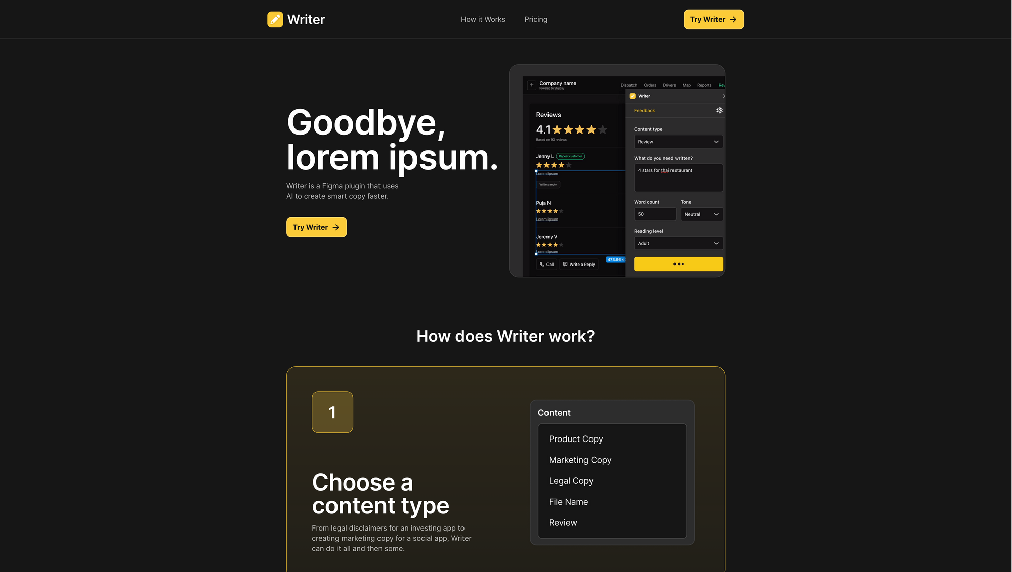 Using Writer is incredibly simple. Once you are done with designing the interface or dedicated components, you can fill it with content. First, you choose a content type within Writer. No matter if you need legal disclaimers for an investing app or marketing copy for a social app, Writer can do it all for you. After choosing the content type, you need to give Writer some instructions. Either enter a basic prompt to get started, or be super specific. You can customize the outcome of Writer up-front by setting a dedicated word count, but you do not have to. Writer also gives you the possibility to define the tone and reading level of the content you would like to create, choose from neutral, friendly, funny, or urgent as the tone, and child, teen, adult, or academic for the reading level, to make sure to match the content to your audience. After that, the only step left is clicking on âCreateâ so your copy gets written. To get more iterations, Writer has a built-in rewrite feature that you can use to get some alternatives to the initial copy.