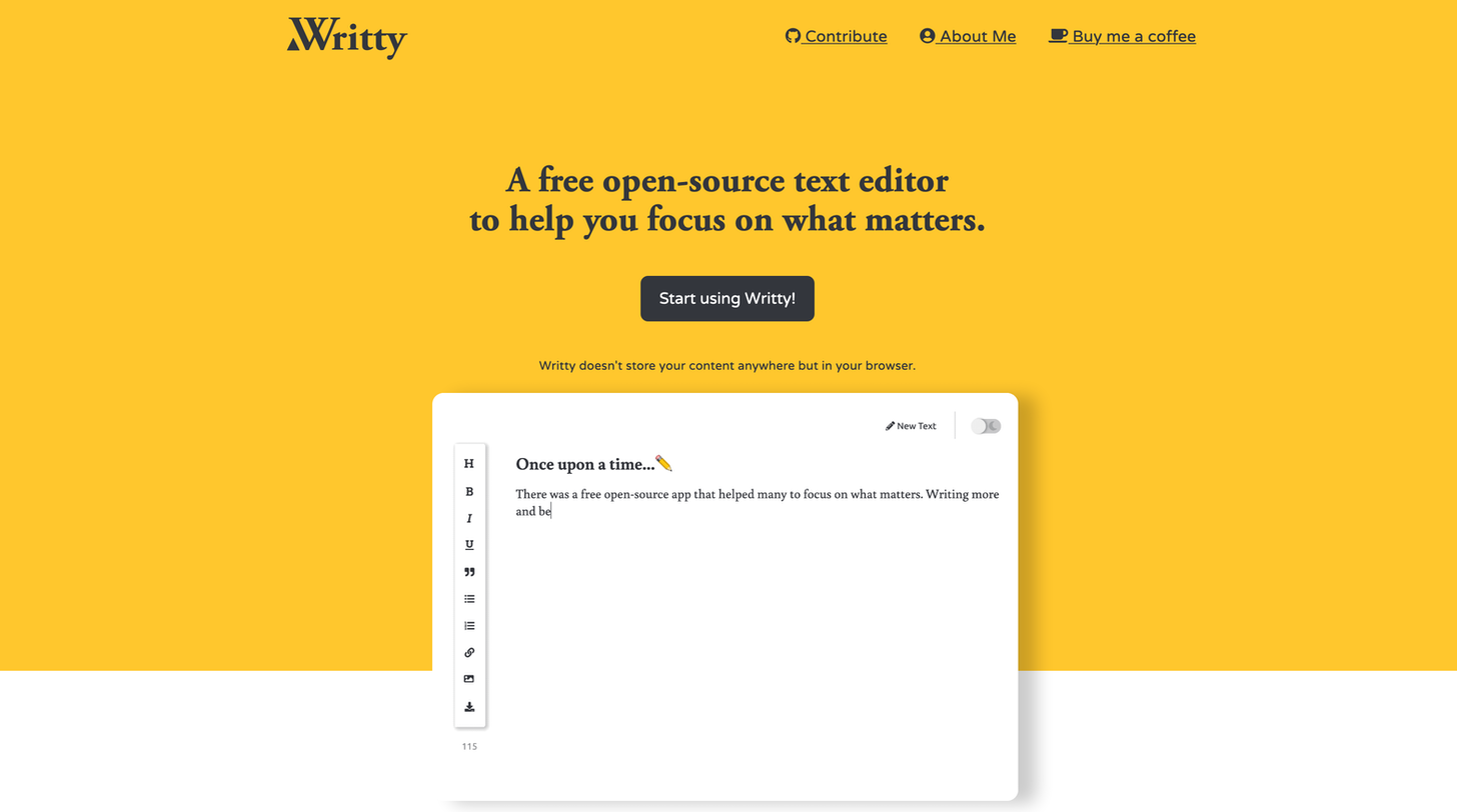 A free open-source text editor to help you focus on what matters. Writty doesn't store your content anywhere but in your browser. 5 Type Styles, Main Editor Functions, Image Uploader, Autosave Session (localStorage), Download as PDF, Word Counter.