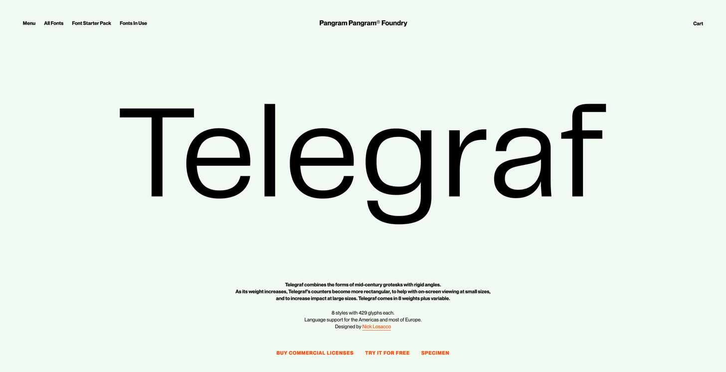 Telegraf is a sans-serif typeface designed by Nick Losacco and published through Pangram Pangram in 2019. The design was inspired by neo-grotesques of the mid-twentieth century and features counters that become more rectangular in the heavier weights. The family is available in eight weights, as well as a variable font version.