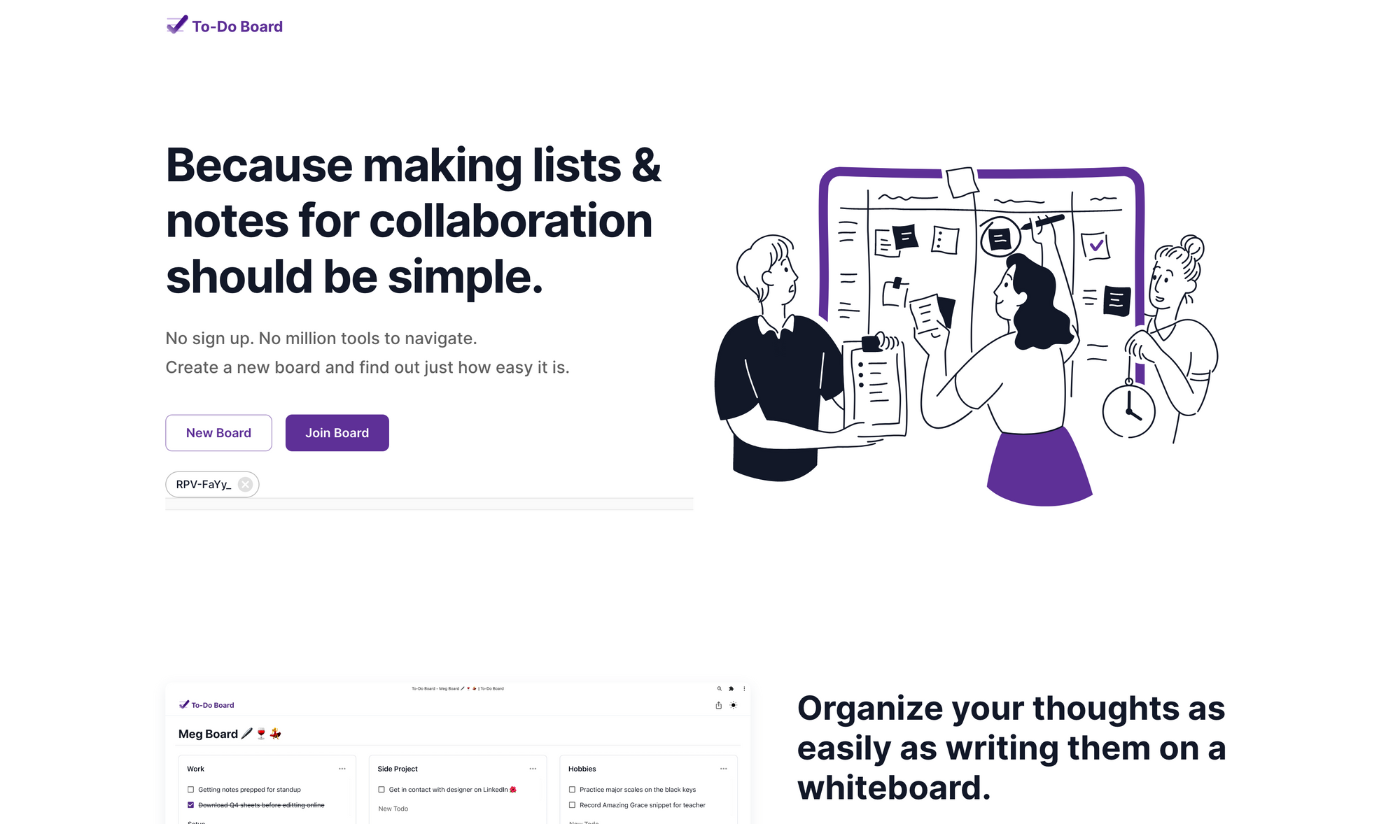 To-Do Board is an incredibly interesting tool because it does not need a sign-up or a million tools to navigate. All you have to do to use it is create a new board or join an already created board, to start working on a project either on your own or collaborate with your team or clients. To-Do Board entitles itself as "the easiest way to track and share your to-do lists". As it already removed the friction of setting up yet another account for another tool to use, this statement seems very plausible.
