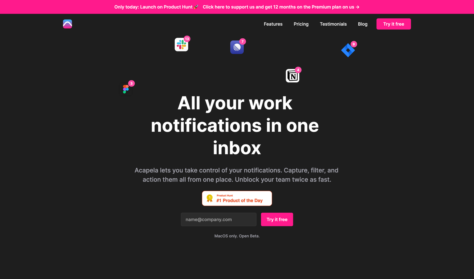 Is your and your team's work scattered across different tools and do you have a hard time keeping track of all the different notifications? Then you should take a look at Acapela, a tool that pulls all your work notifications into one unified inbox. Acapela is a dedicated tool to take back control of all your notifications by capturing, filtering, and taking action on them from one place.