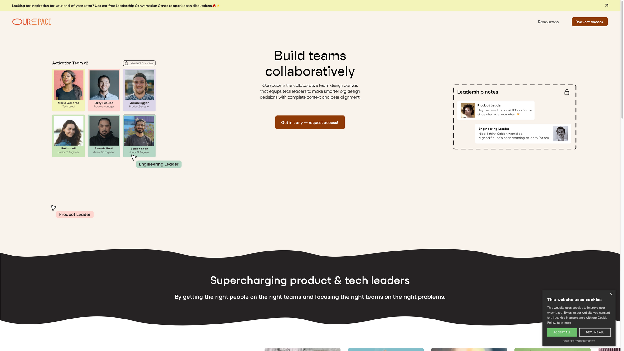 Ourspace is a collaborative team design canvas, that equips teach leaders to make smarter org design decisions with complete context and peer alignment. To supercharge your product one of the most important factors is to get the right people on the right teams and make sure that the right teams focus on the right problems. With Ourspace, you can visualize how the surface area of your product and tech stack could be distributed among more or fewer teams. You get an idea of how to put our people on the right priorities by leveraging key context about each person when you need it most. Additionally, you can create an accurate map of who works on what in just seconds. Any colleague can reference to that map to navigate your dynamic people and teams.