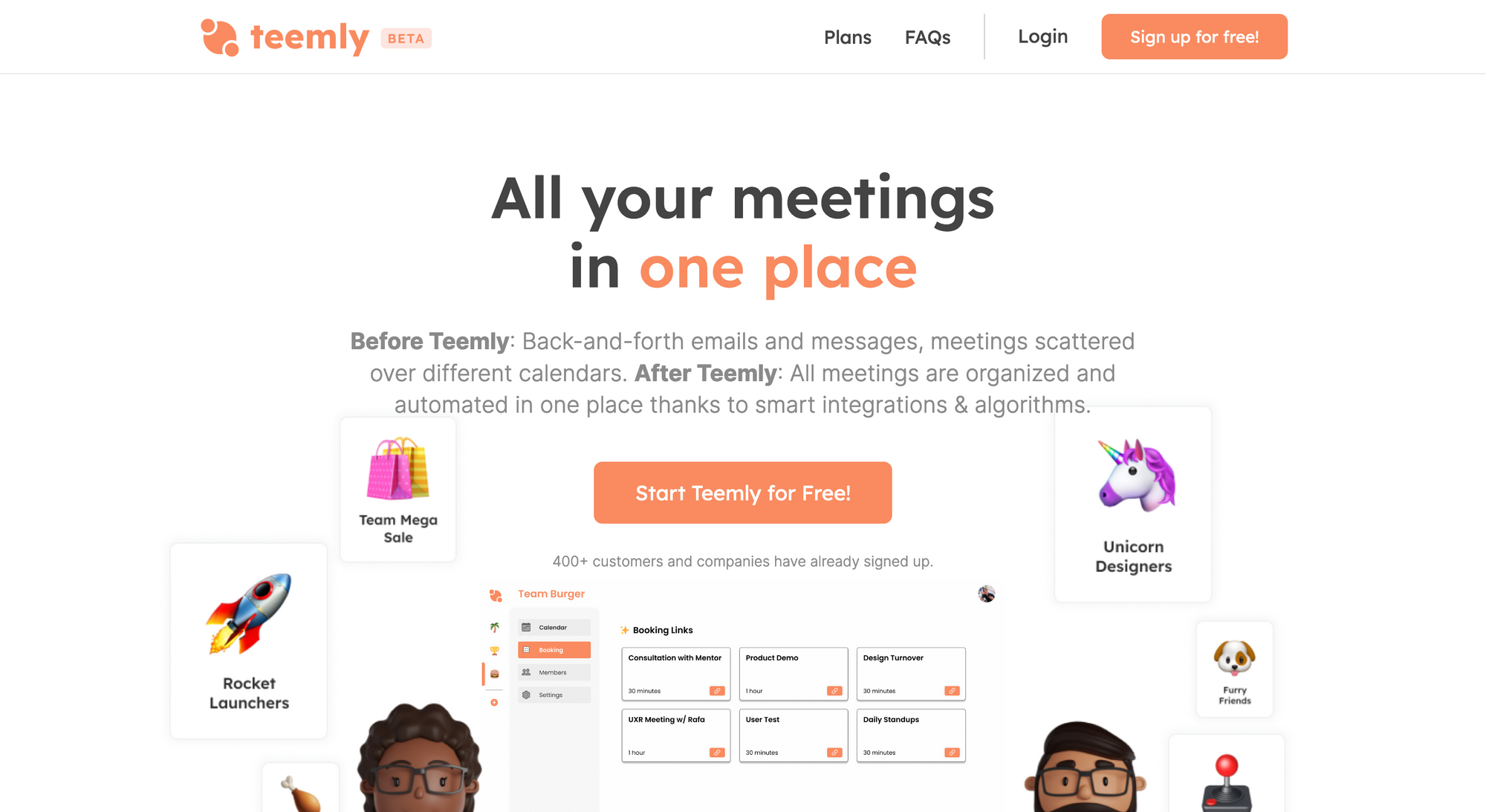Teemly is a superb tool to have all your meetings organized, structured, and automated within one beautiful place, combined with smart integrations and algorithms. It probably happened to all of us: send emails back-and-forth, countless messages, to schedule a meeting, and ultimately have everything scattered over different calendars.