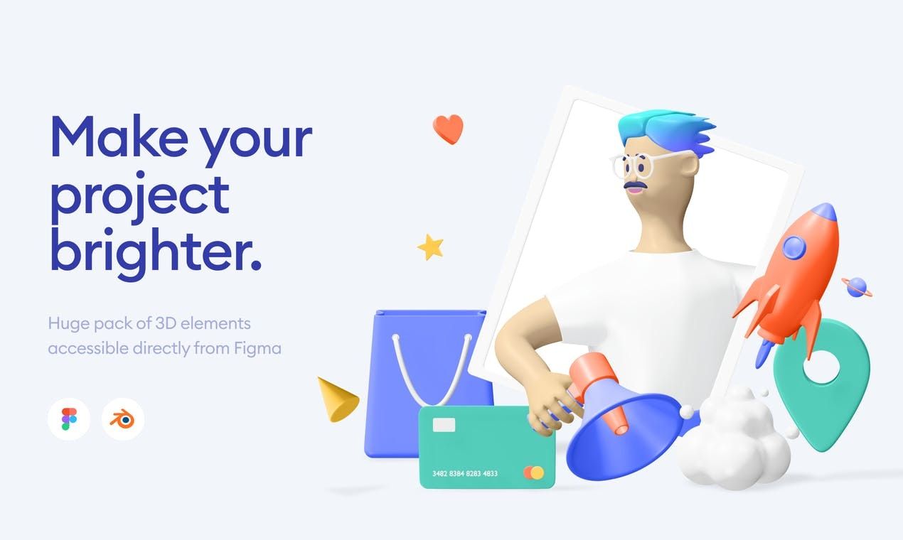 Huge pack of 3D elements accessible directly from Figma. All elements fit together. Just grab what you like for your project and make your own scene in no time.
