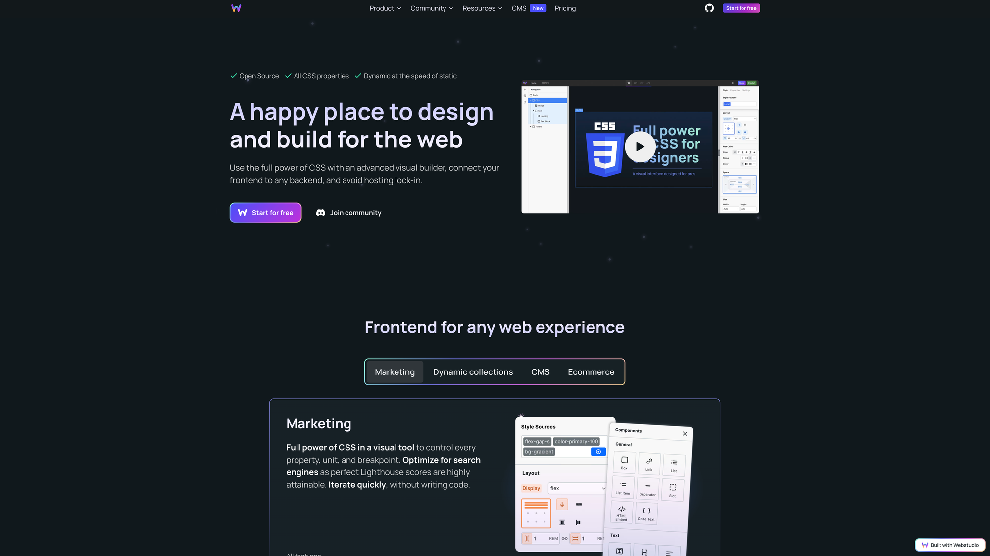 Webstudio offers a powerful frontend for any web experience. You get to experience the full power of CSS in a visual tool. Get control over every property, unit, and breakpoint, optimize your website for search engines, make sure all your pages are loading incredibly fast, and iterate quickly. All of that happens without writing a single line of code. Thanks to dynamic collections with filters and searches, you can fetch exactly what you need from relational data with custom queries. In May 2024, Webstudio announced the possibility to connect it to any headless CMS, providing a nearly code-like level of customization minus the complexity and cost of developing a custom-coded frontend. Besides that, dedicated E-Commerce support by uniting Shopify's E-Commerce backend with Webstudio's visual builder for the frontend is already on the roadmap and in the works.