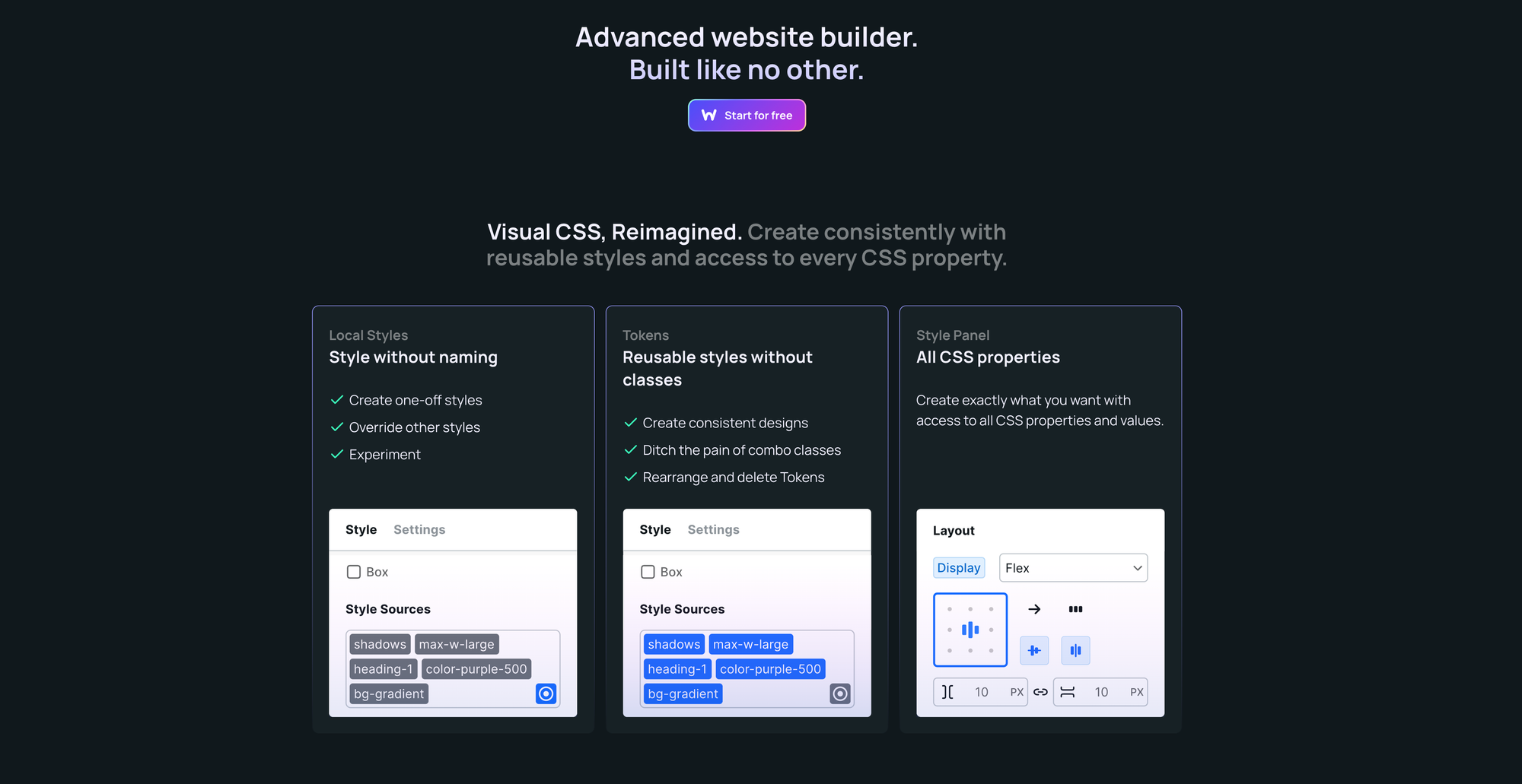 Webstudio* is packed with features that help you creating and designing consistently by using styles that can be reused and accessed by every CSS property. Thanks to Local Styles, you can create one-off styles and override other styles. This is super useful in case you want to iterate quickly on a specific design. With Tokens you can really power up your workflows and make sure your design is consistent. Webstudio's Style Panel gives you a familiar interface to create exactly what you want and you probably feel at home already if you have used Webflow before.