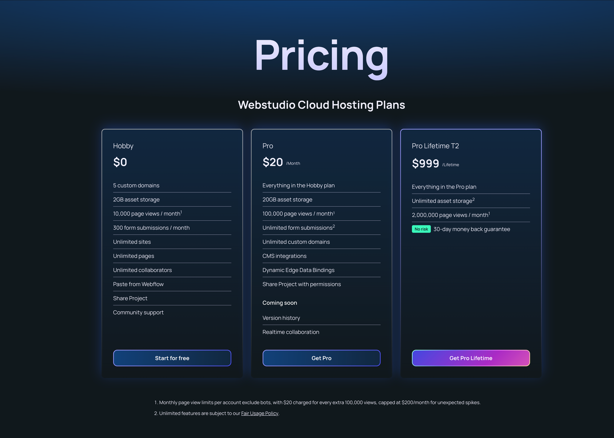 Besides that, you can also grab a Pro Lifetime option, which includes everything from the Pro Plan plus unlimited asset storage, 2,000,000 page views per month, and a 30-day money back guarantee. The Pro Lifetime option costs you $999.