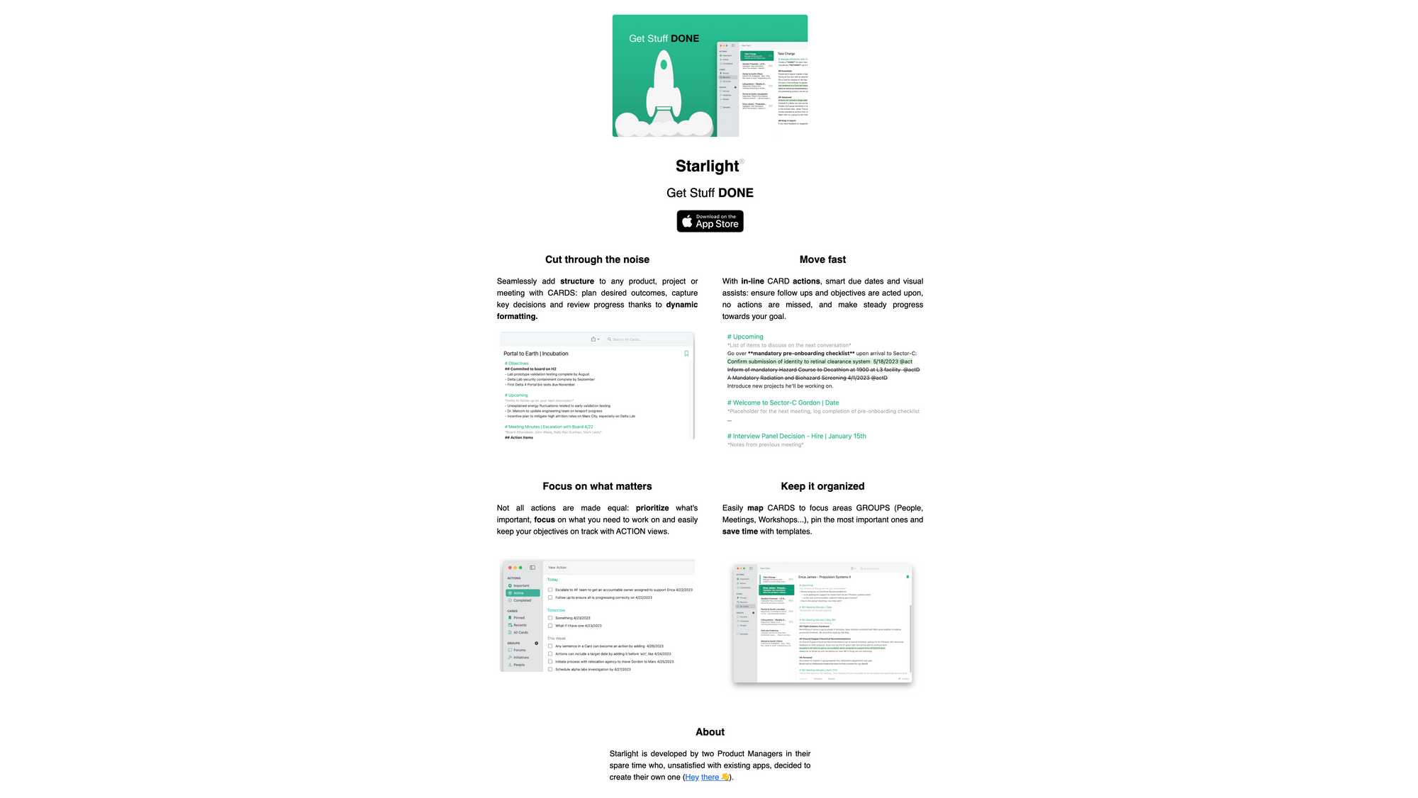 Starlight was made to cut through the noise. It is a super simple tool to take notes, manage projects, see what is on your plate, and get stuff done. To seamlessly add structure to any product, project, or meeting within Starlight, it follows the Cards approach, which means the content you create within Starlight is organised and structured within cards. This gives you the possibility to plan desired outcomes, capture key decisions, and review progress thanks to dynamic formatting. Organising the notes, information, tasks, ideas, and thoughts that you jot down within Starlight, it gives you the possibility to map cards to focus areas which are called Groups. Groups within Starlight can be people, meetings, workshops, or others. The most important ones can be pinned within the sidebar, so you ensure easy and fast access to them.