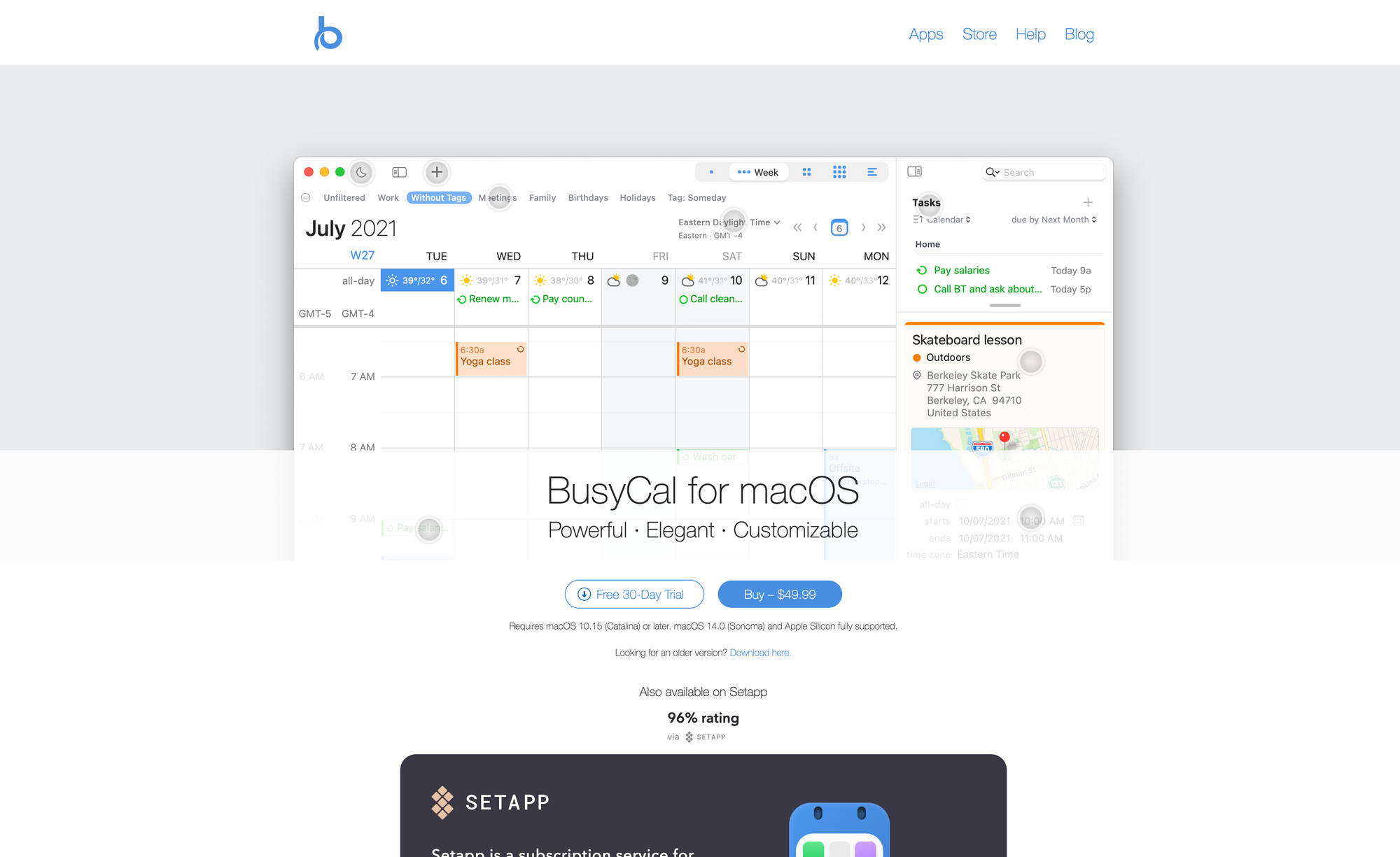 Additionally, BusyCal gives you the possibility to integrate tasks into your calendar and display task lists in the right sidebar. With its menu bar app, BusyCall offers a quick and easy way to keep track of your schedule without the need to open the actual app every single time. Besides all of that, BusyCal is packed with even more lovely features like smart filters, alarms, tags, weather, quick entry, and travel time. You can download BusyCal for free and enjoy its features for 30-days without getting charged. To keep your access to all the features, you need to upgrade to either the monthly plan which is available for âŹ3.99 or the yearly plan available for âŹ34.99. If you have an active Setapp subscription you can download BusyCal right away.