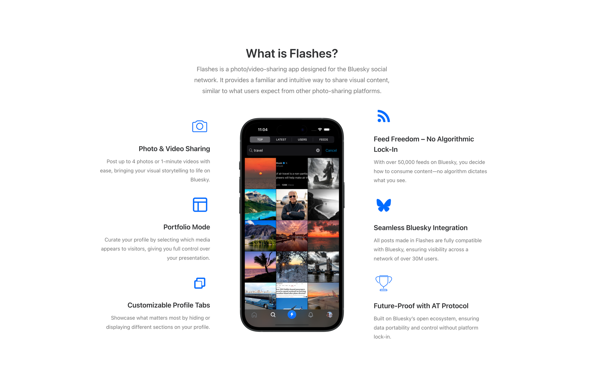 So, how does Flashes work? Flashes is a photo and video-sharing app designed for Bluesky, that provides a familiar and intuitive way to sahre visual content similar to what users expect from other photo-sharing platforms. You can post up to 4 photos or 1-minute videos with ease, bringing your visual storytelling to life on Bluesky. Portfolio Mode allows you to curate your profile by selecting which media appears to visitors. Additionally, you can customize your profile tabs and showcase what matters most by hiding or displaying different sections on your profile. Thanks to the Bluesky network, you decide how to consume content, as there is not algorithm involved. Since Flashes is built on top of Bluesky, all posts that are made in Flashes are fully compatible with Bluesky, so you can be sure that your posts are visible across a network of over 30M users.
